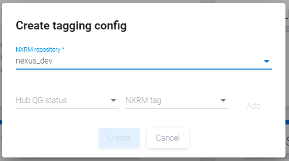 Выберите NXRM repository из выпадающего списка и во вновь появившихся полях Hub QG status и NXRM tag попарно сопоставьте статусы QG и теги репозитория. Чтобы сопоставить такую пару, кликните поле Hub QG status и выберите статус QG из выпадающего списка. Затем кликните поле NXRM tag и выберите тег репозитория из выпадающего списка.