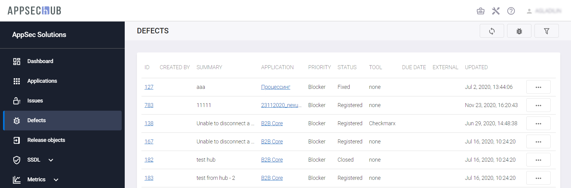 - STATUS — статус дефекта показывает текущий этап жизненного цикла дефекта в AppSec.Hub (Registered, Open, Fixed, In Progress, Closed или Rejected).