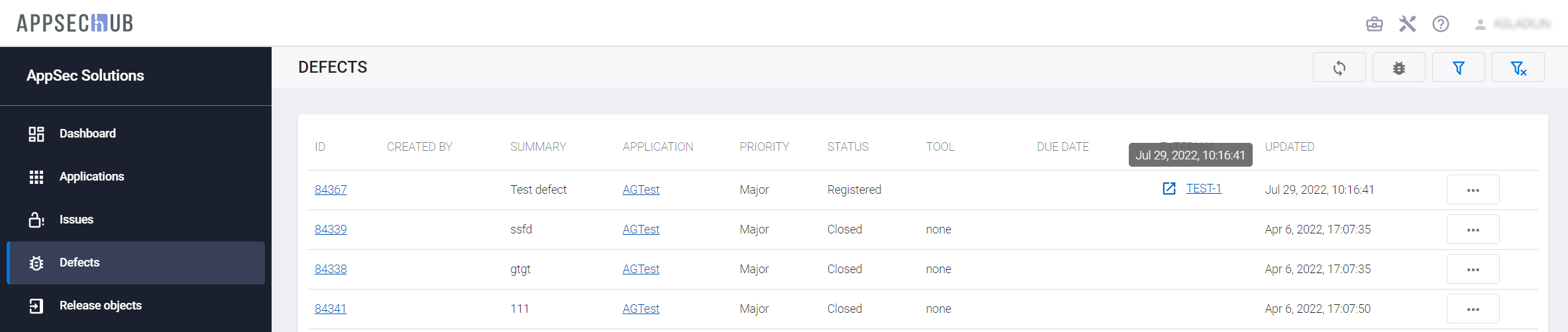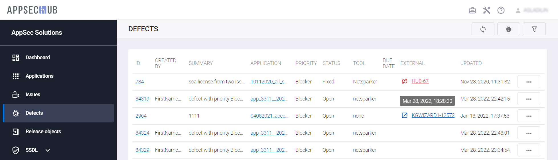- EXTERNAL — ссылка на дефект в проектной системе отслеживания дефектов, соответствующий дефекту в AppSec.Hub.