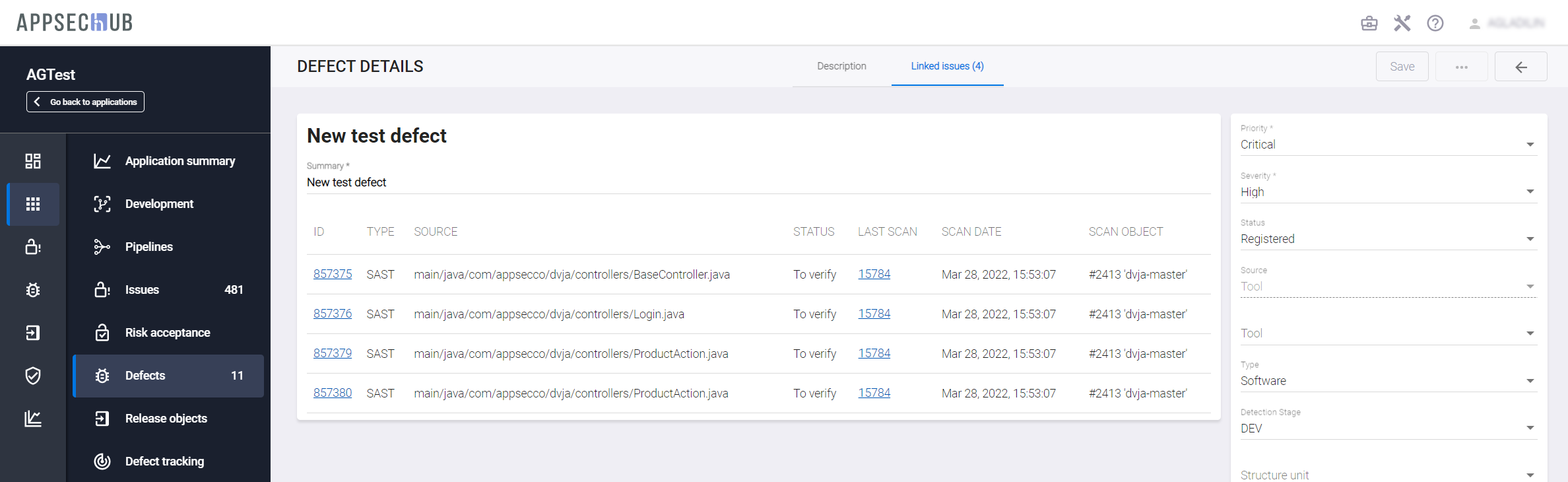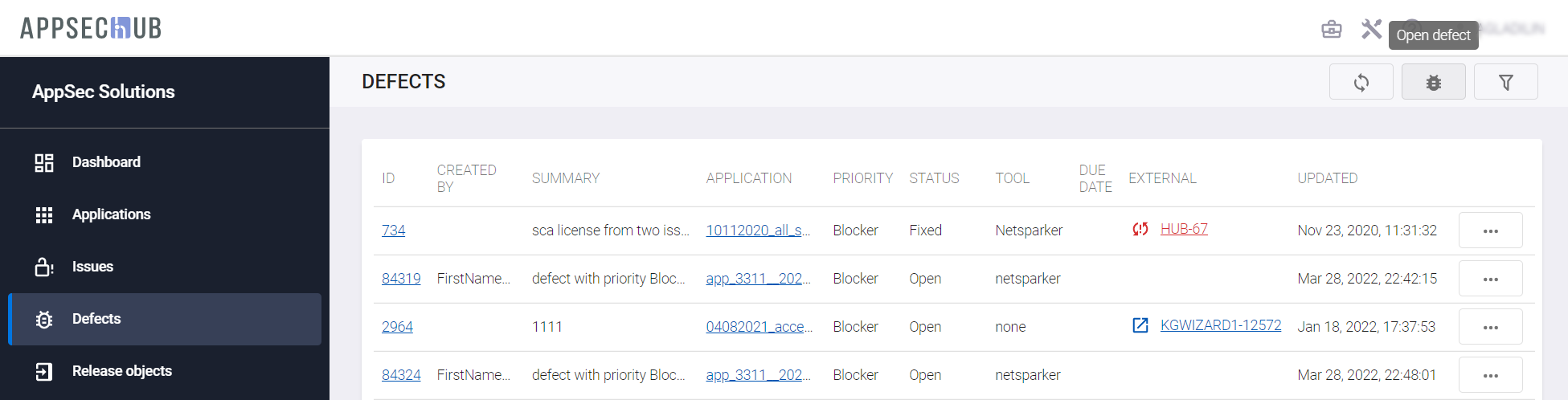 Все связанные с дефектом проблемы безопасности будут переведены в статус Open. Также будет создан новый дефект безопасности со статусом Open. Выберите слева в консоли пункт меню Defects, чтобы увидеть вновь созданный дефект безопасности на странице дефектов приложения.