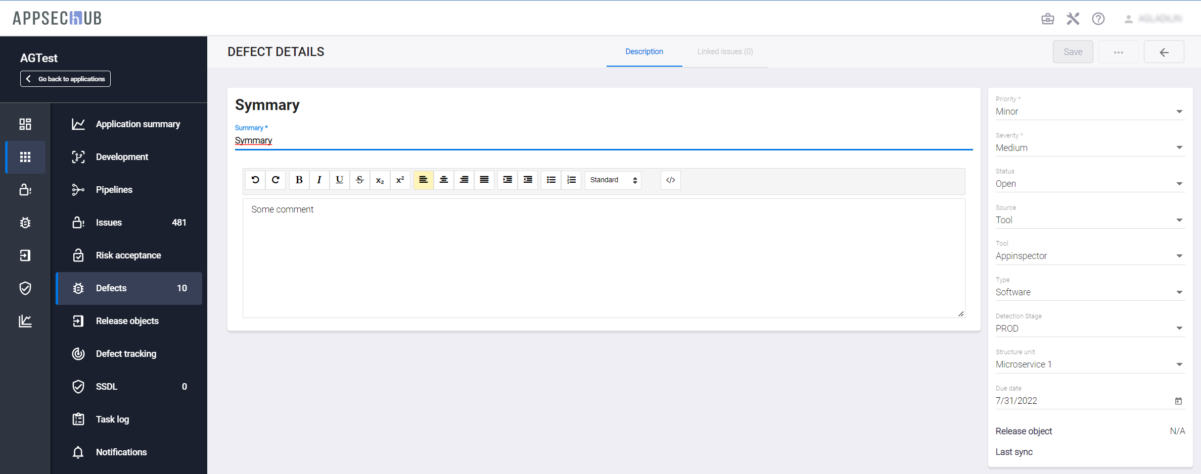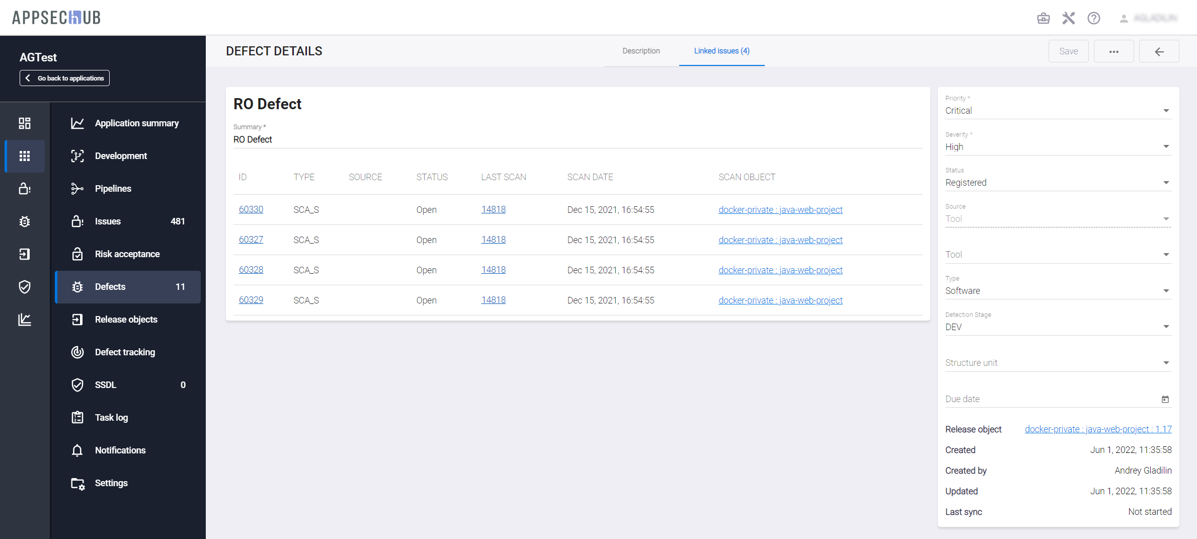 Нажмите на строку с дефектом безопасности на странице дефектов приложения, чтобы посмотреть детальную информацию о нем. На экране появится окно с двумя вкладками: Description и Linked issues. Для дефектов, которые создаются на основе проблем безопасности, обнаруженных в ходе сканирования, привязанного к релизному объекту, вкладка Description дополнительно содержит поле Release object со ссылкой на соответствующий релизный объект.