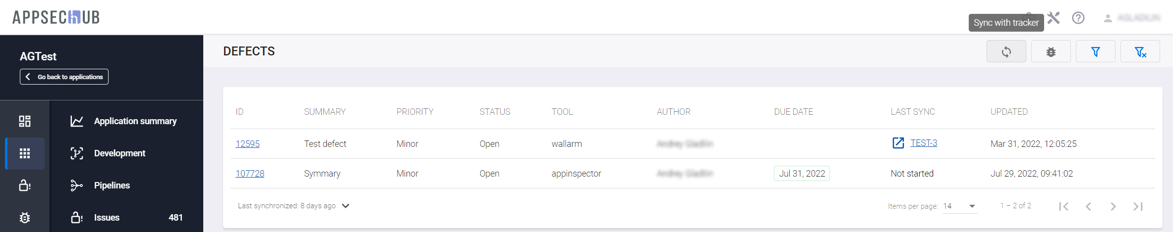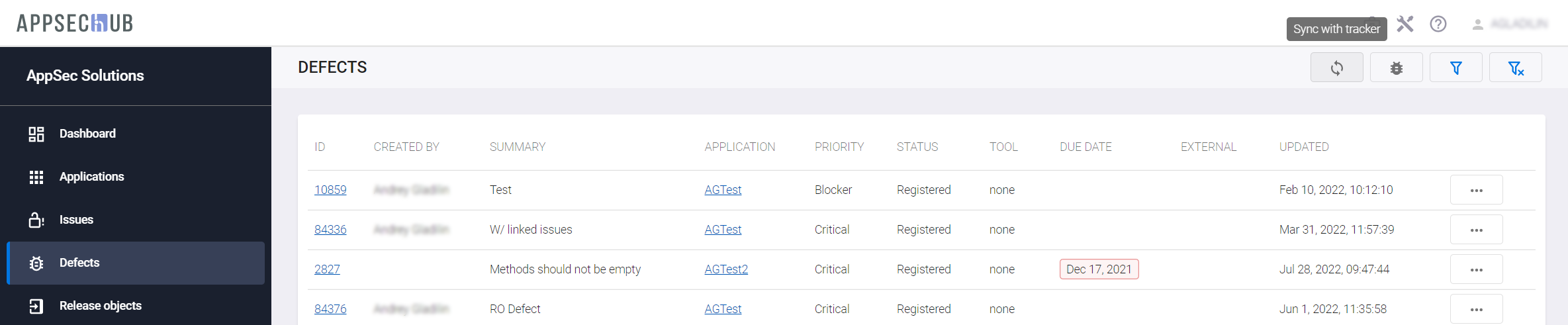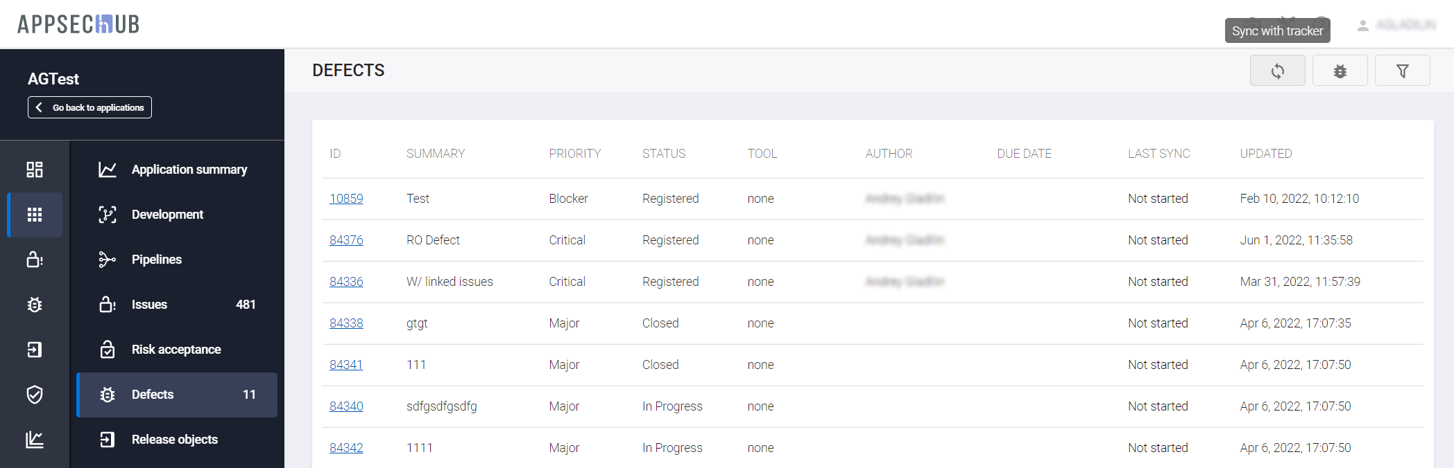 Как было описано в предыдущем разделе, выберите приложение и нажмите пункт меню Defects. На экране появится страница дефектов приложения. Нажмите кнопку Sync with tracker