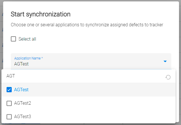 Выберите в этом окне приложения, дефекты которых необходимо синхронизировать с проектной системой отслеживания дефектов. Чтобы выбрать все доступные пользователю приложения, нажмите пункт Select all. Отдельные приложения можно выбрать, нажав на выпадающее меню Enter Application Name. Можно воспользоваться поиском нужных приложений, введя имя или часть имени приложения в поле Search.