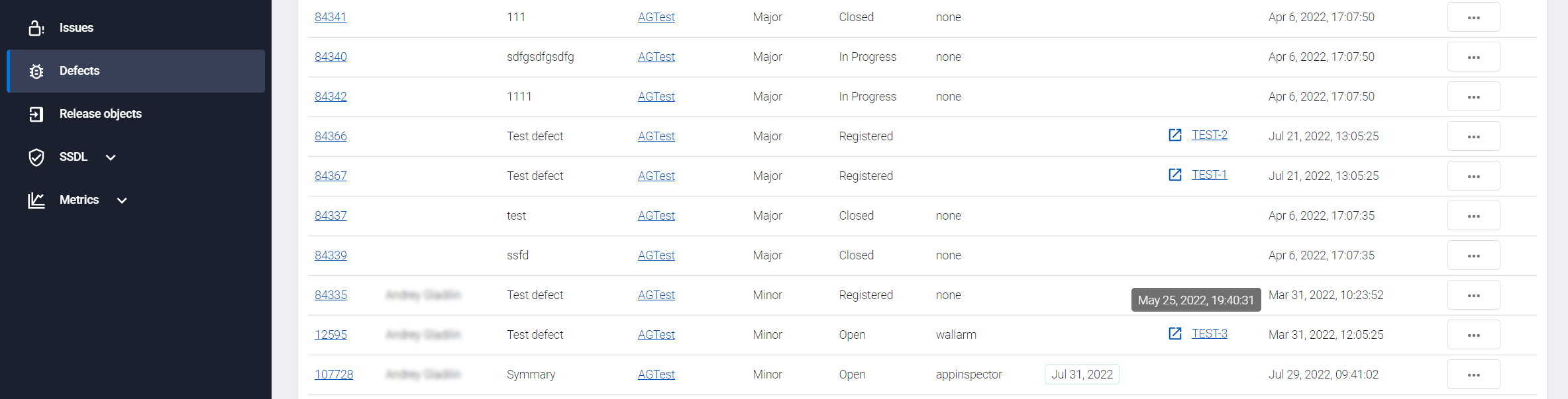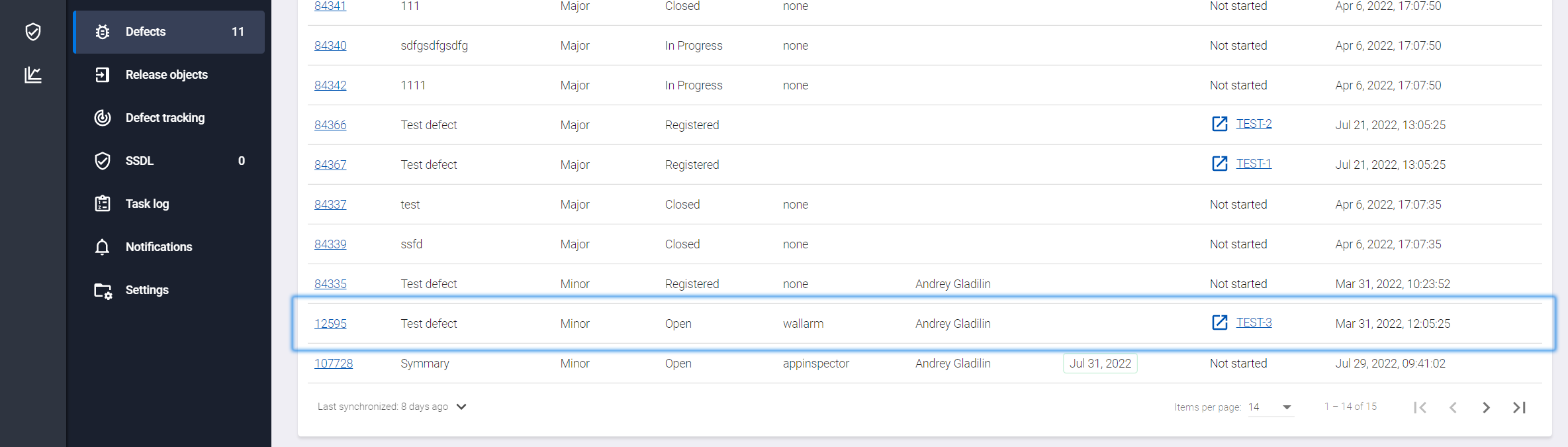 - Last sync — дата последней синхронизации дефекта с проектной системой отслеживания дефектов.
