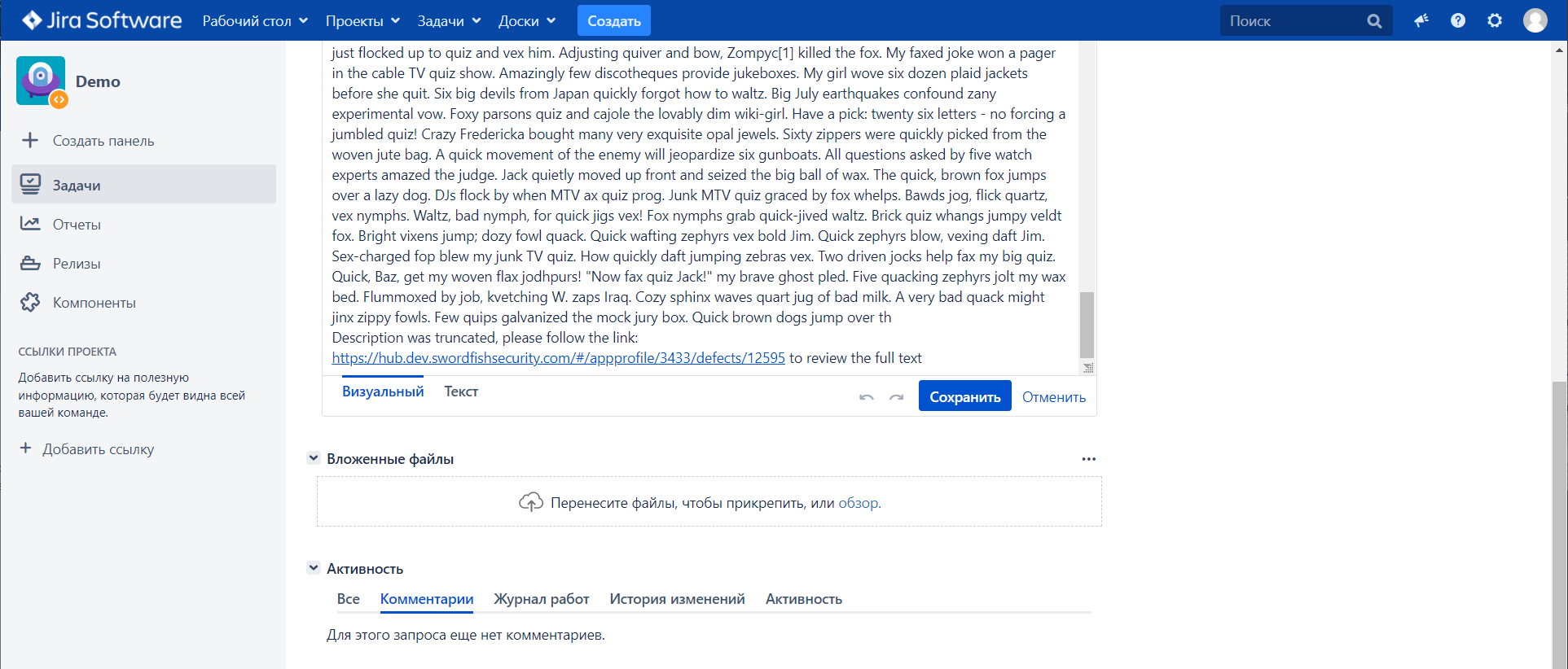 Особенность Jira такова, что при синхронизации в описание дефекта можно передать не более 32 000 символов. Чтобы сохранить возможность ознакомления с полным описанием дефекта, в соответствующую задачу Jira передается ссылка на полное описание дефекта в AppSec.Hub.