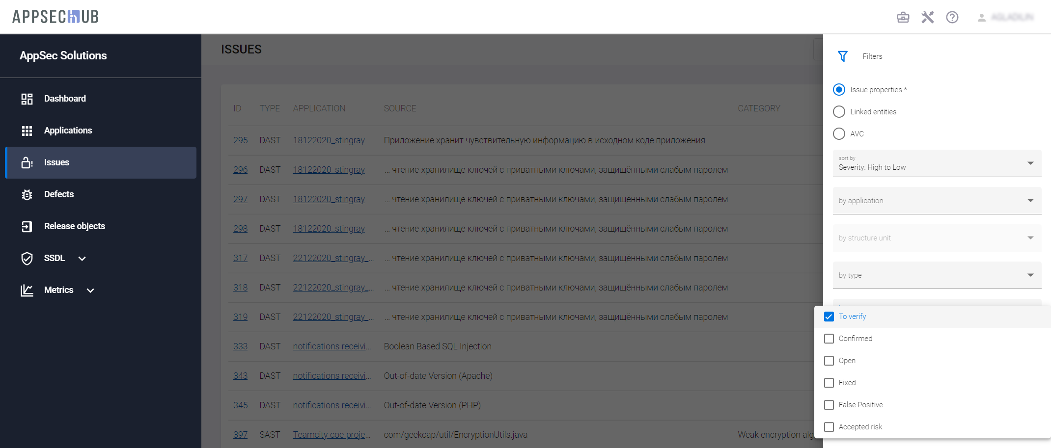 На вкладке Filters выберите один из типов проблем безопасности в поле by type (SAST, DAST, SCA Compliance или SCA Security) и статус To verify в поле by status.