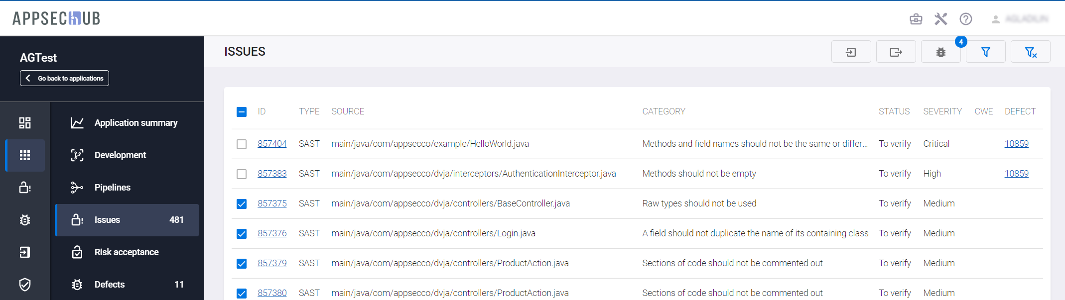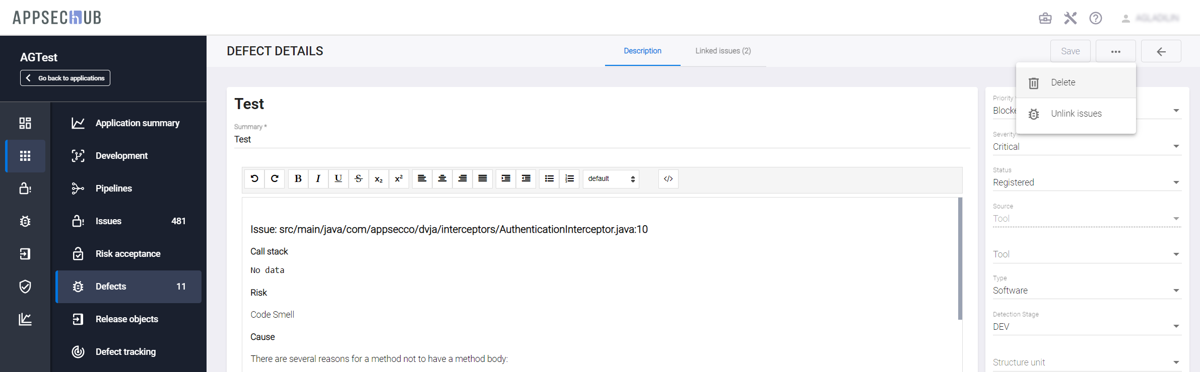 Создать новый дефект безопасности в AppSec.Hub на основе проблем безопасности можно либо на странице приложения, либо на общей странице проблем безопасности Issues.