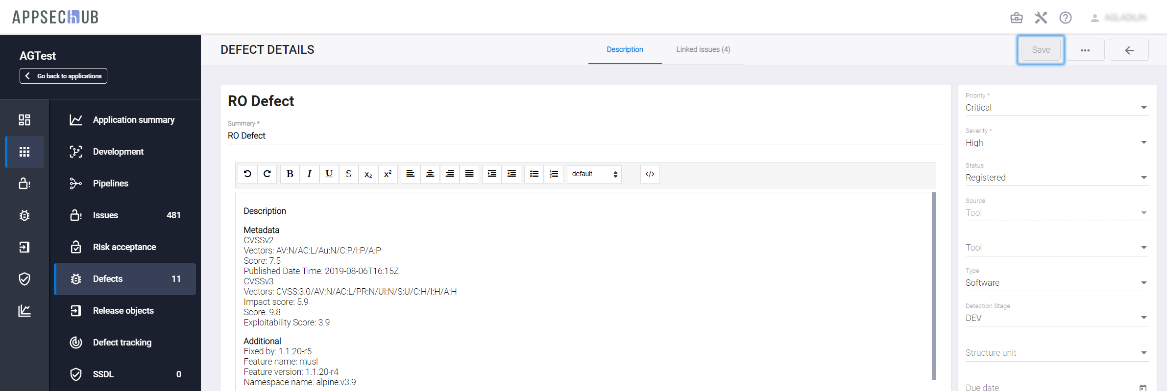 Введите/отредактируйте сведения о дефекте и нажмите кнопку Save в правом верхнем углу интерфейса пользователя.
