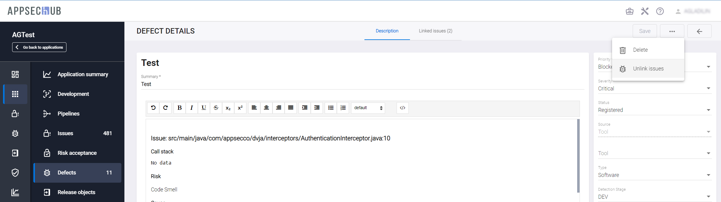 Предусмотрена возможность удаления из дефекта связанных с ним проблем безопасности. Открыв окно дефекта безопасности, нажмите кнопку Actions