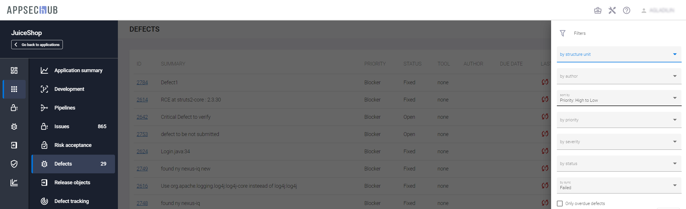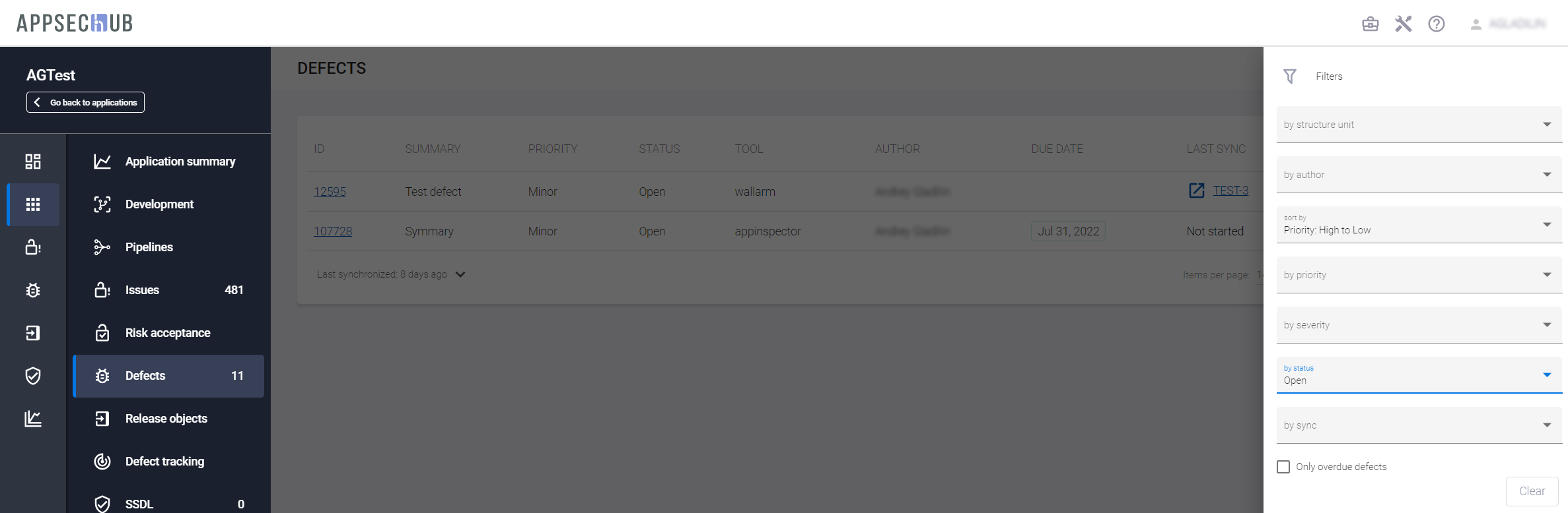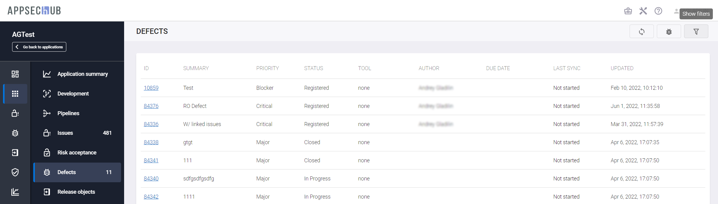 Чтобы синхронизировать дефекты для одного выбранного приложения, выберите пункт меню Applications в левом верхнем углу интерфейса пользователя, выберите приложение и нажмите на иконку Show app details в правом нижнем углу карточки этого приложения. Слева в меню выберите пункт Defects. Находясь на странице Defects, нажмите кнопку Show filters cправа вверху.