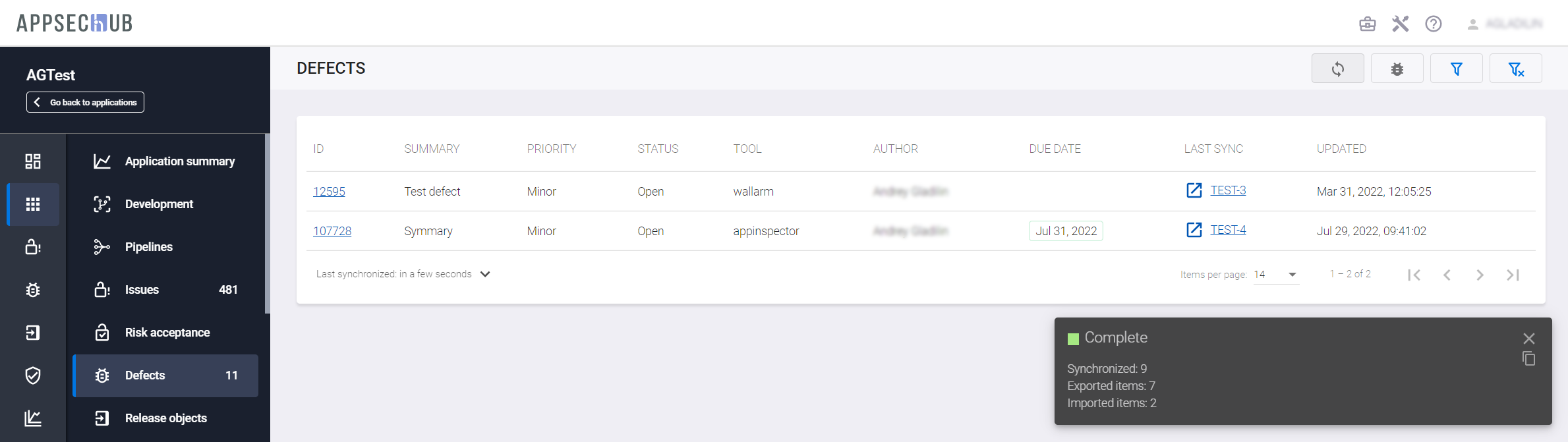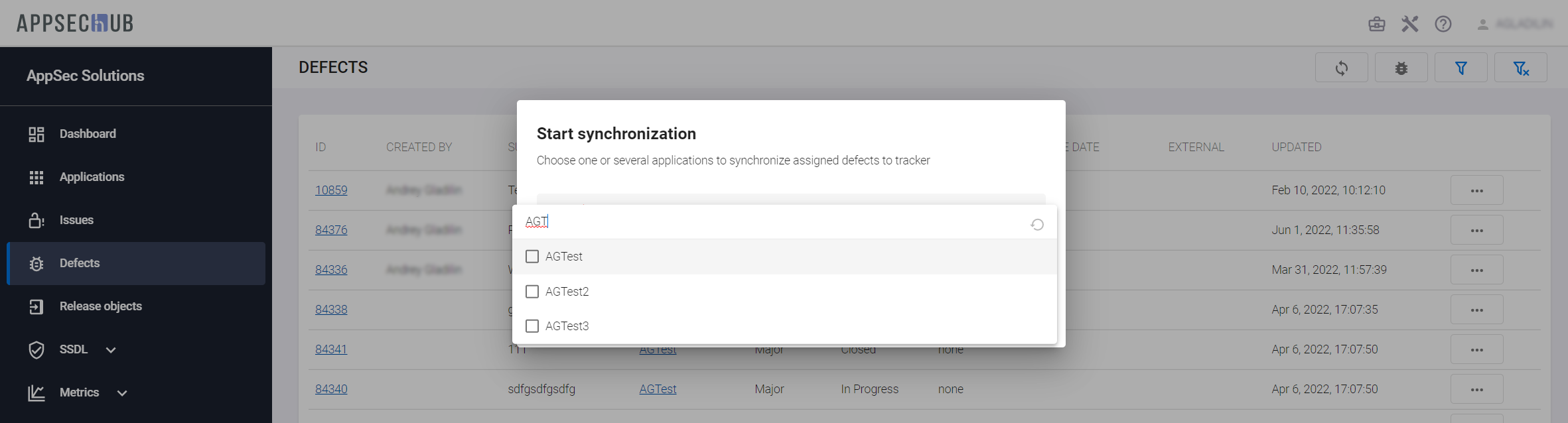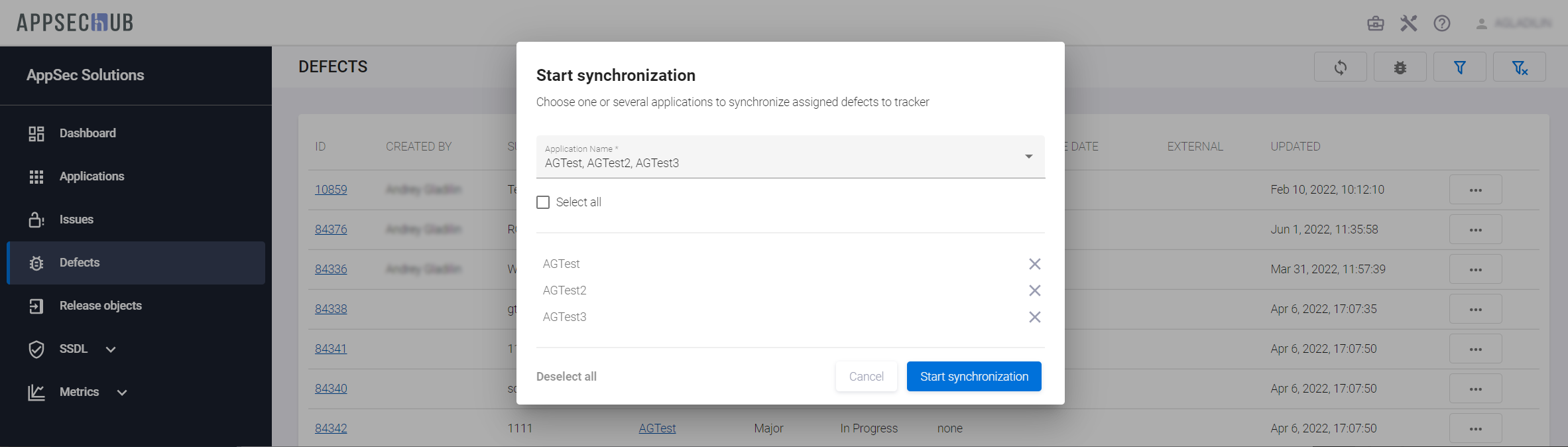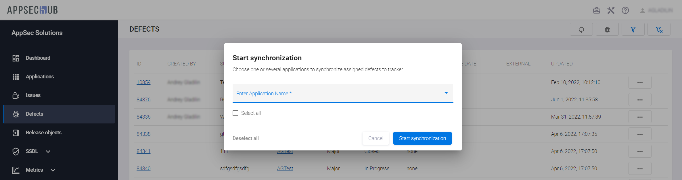 AppSec.Hub позволяет синхронизировать дефекты как для одного выбранного приложения, так и для всех приложений, к которым пользователь имеет доступ.