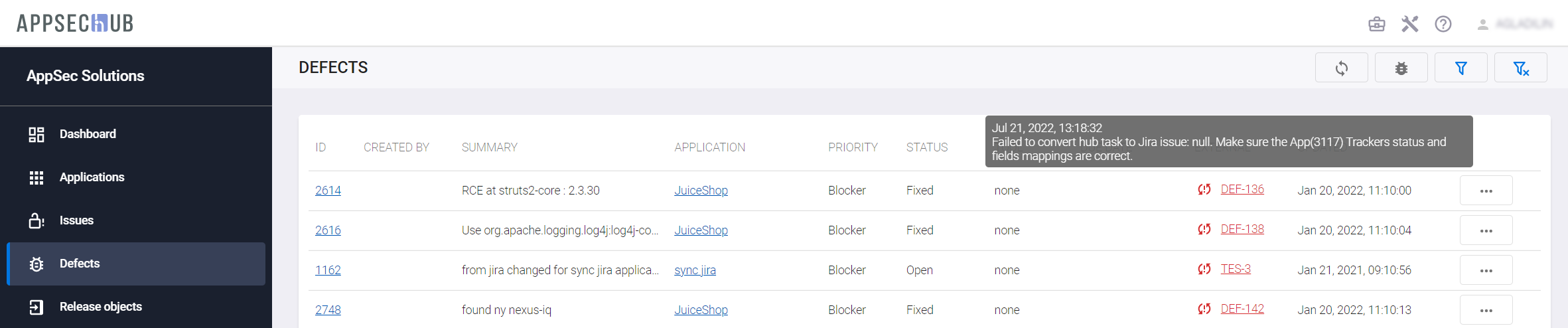 Дефекты безопасности были синхронизированы между AppSec.Hub и Jira.