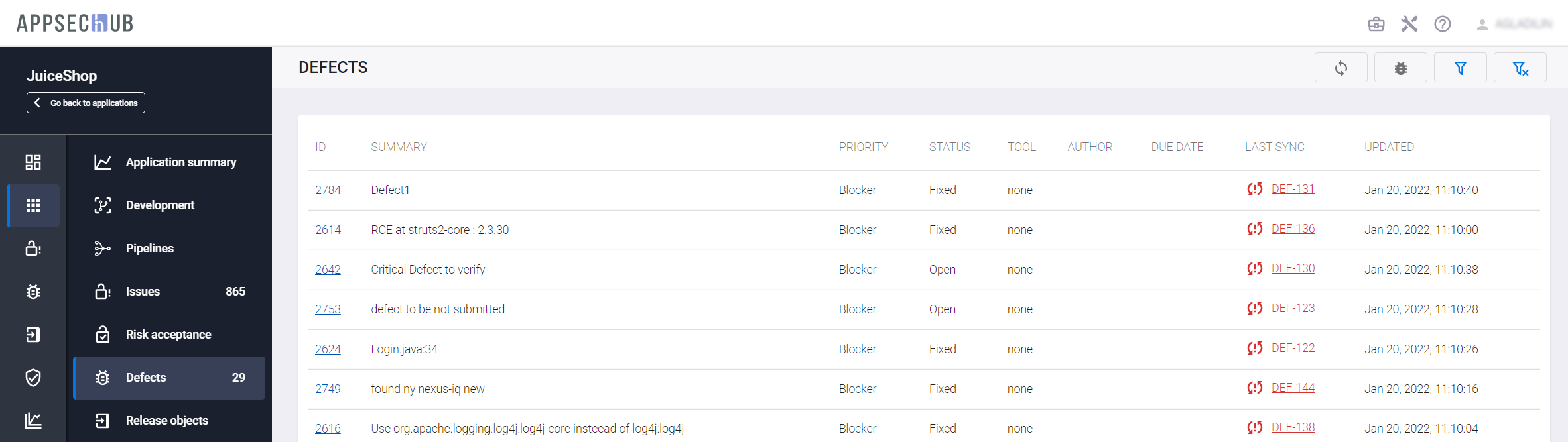 Каждый дефект безопасности должен быть исправлен командой разработчиков приложения. Когда дефект исправлен, разработчики меняют статус дефекта безопасности Jira на Fixed. Теперь дефект необходимо синхронизировать между Jira и AppSec.Hub.