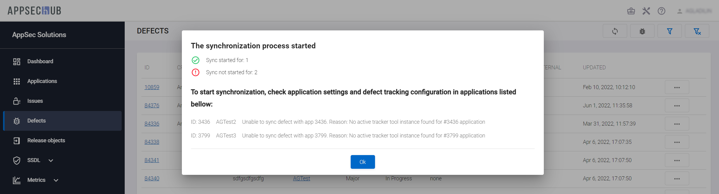 Чтобы начать процесс синхронизации, нажмите кнопку Start synchronization в правом нижнем углу окна. На экране появится окно The synchronization process started. В этом окне содержится информация о том, для каких дефектов был начат процесс синхронизации, а для каких он не стартовал по каким-либо причинам с указанием ID приложения, его имени и описанием ошибки. Нажмите кнопку Ok внизу окна.