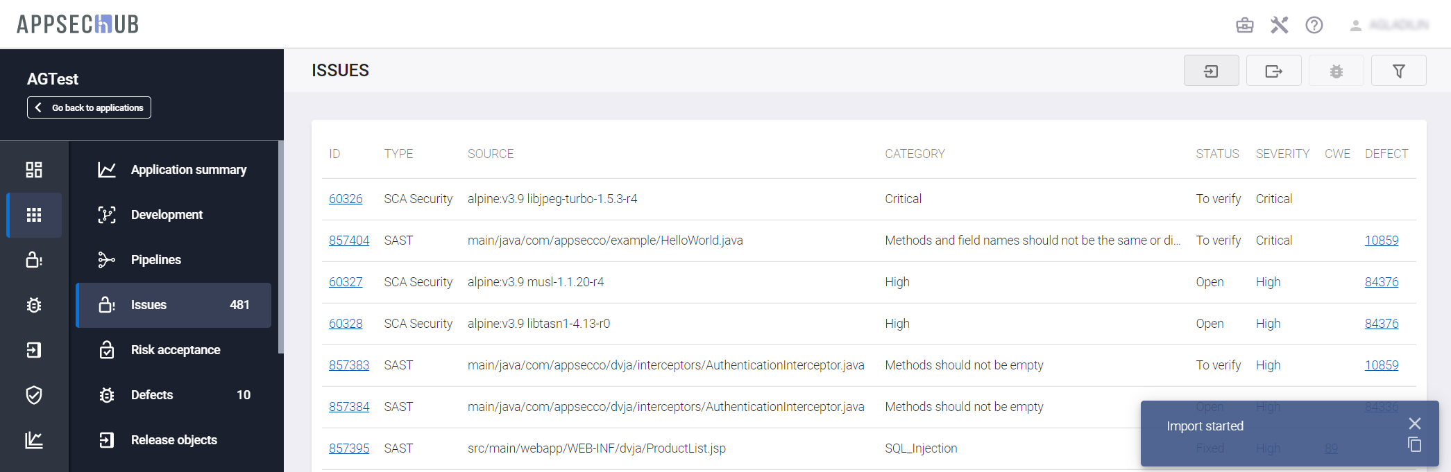 в правом верхнем углу, чтобы импортировать проблемы из инструментов AST. В правом нижнем углу появится подтверждение начала импорта Import started.