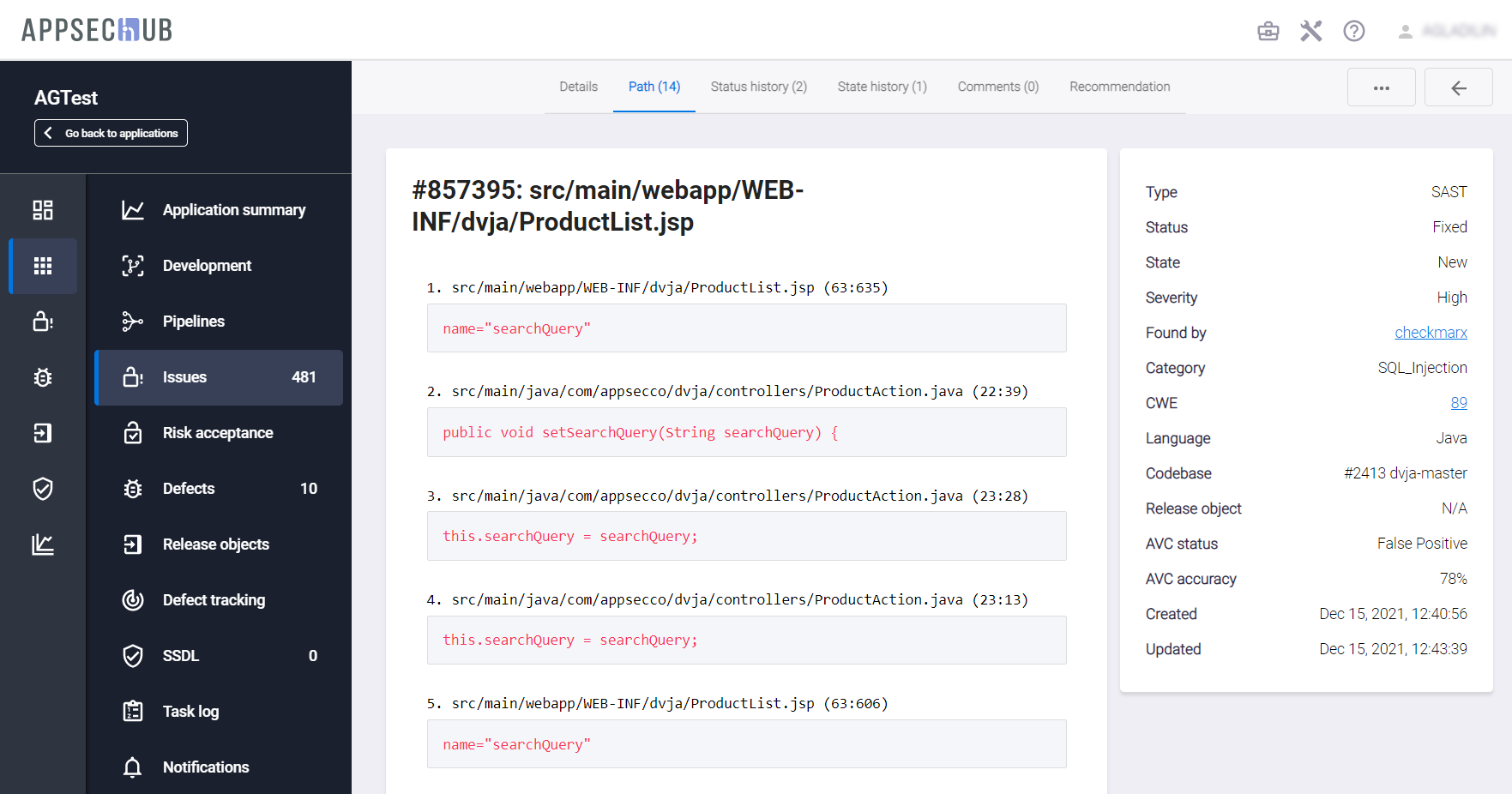 Details — подробная информация о проблеме с указанием потенциальной опасности, причины ее возникновения, а также рекомендаций по устранению. Для проблем безопасности, обнаруженных в ходе сканирования, привязанного к релизному объекту, приводится дополнительная ссылка на релизный объект. Кроме того, в полях AVC Status и AVC Accuracy приведены результаты AVC-анализа (Application Vulnerabilities Correlation), см. раздел «Настройки корреляции уязвимостей приложения» Руководства администратора.