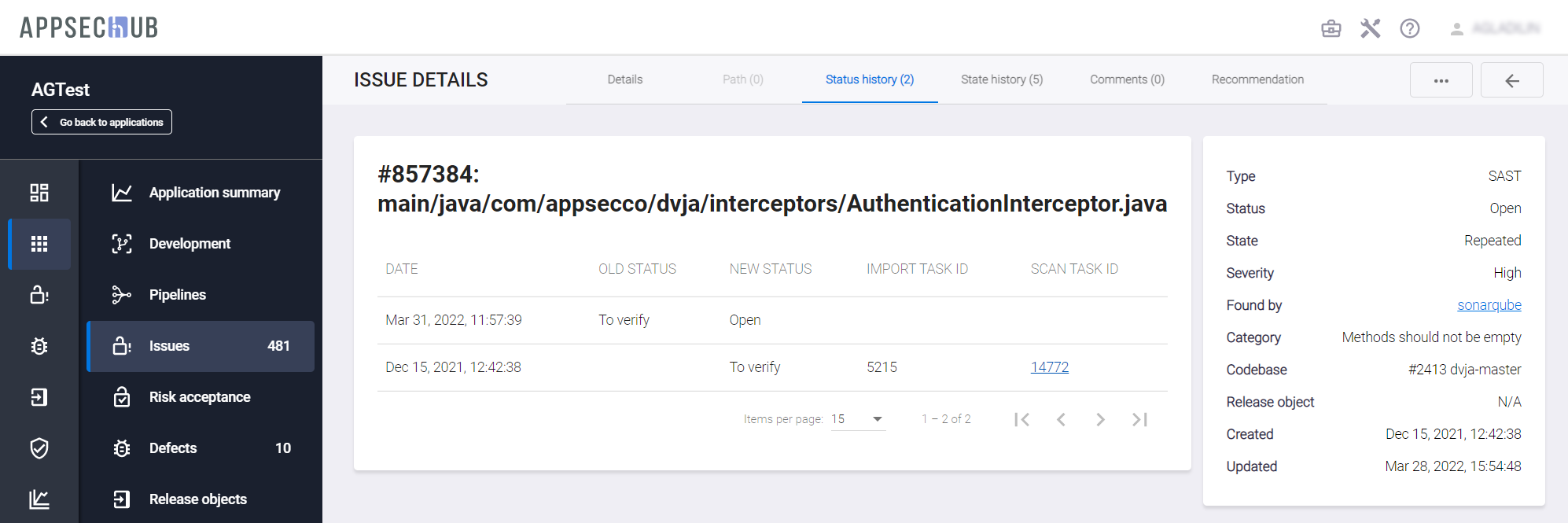 AppSec.Hub анализирует историю каждой проблемы безопасности. Если проблема была обнаружена во время сканирования безопасности, но затем не была обнаружена во время следующего сканирования безопасности, она автоматически получает статус Fixed.