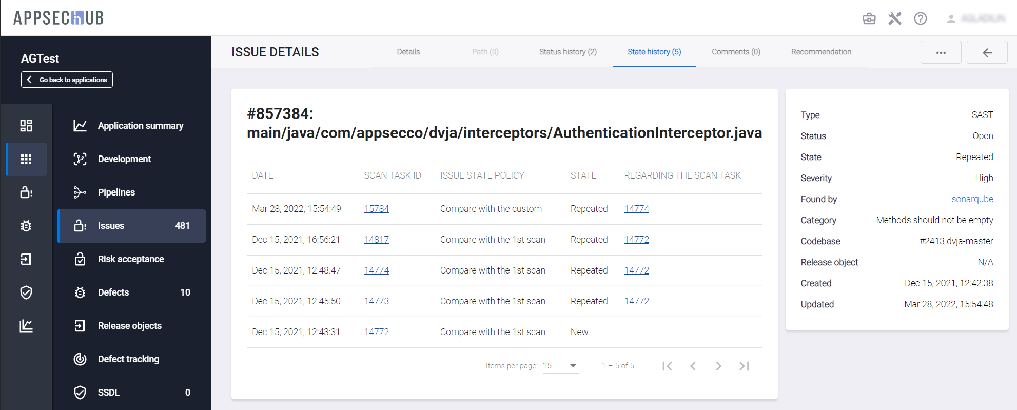 State history — история изменения состояний проблемы безопасности. Помимо даты, времени и идентификатора сканирования на вкладке отображается состояние проблемы безопасности (NEW, REPEATED), выбранный алгоритм изменения статуса (ISSUE STATE POLICY), а также идентификатор сканирования, с результатами которого осуществлялось сравнение (REGARDING THE SCAN TASK).
