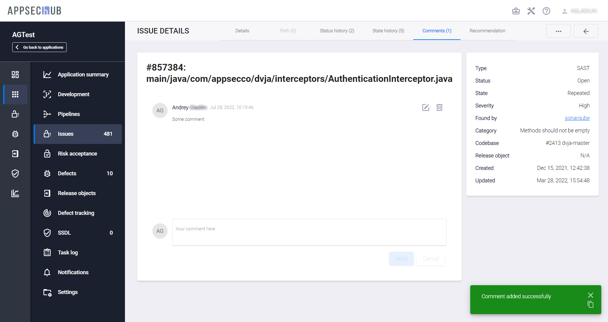 Comments и Recommendation — обеспечивают возможность добавления соответственно комментариев и рекомендаций. Они будут сохранены после нажатия кнопок Send на вкладке Comments или Save на вкладке Recommendation. Если в дальнейшем будут обнаружены похожие проблемы безопасности, все сохраненные рекомендации будут автоматически добавлены к ним. Эта функциональность реализована в AppSec.Hub на основе анализа корреляции проблем.