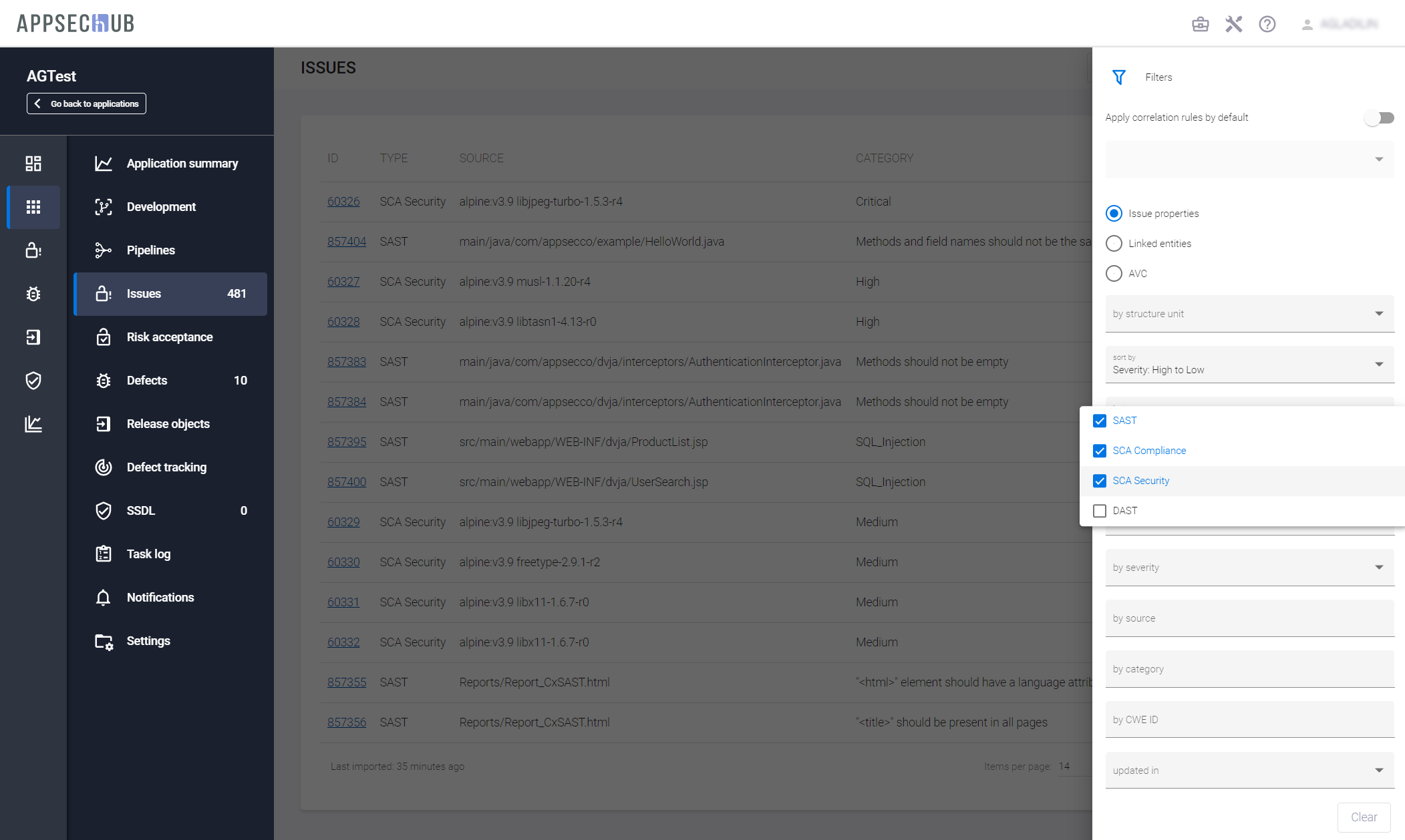 После завершения на экране появятся импортированные проблемы. В показанном на рисунке выше примере проблемы были обнаружены в результате запуска инструментов SCA и SAST.