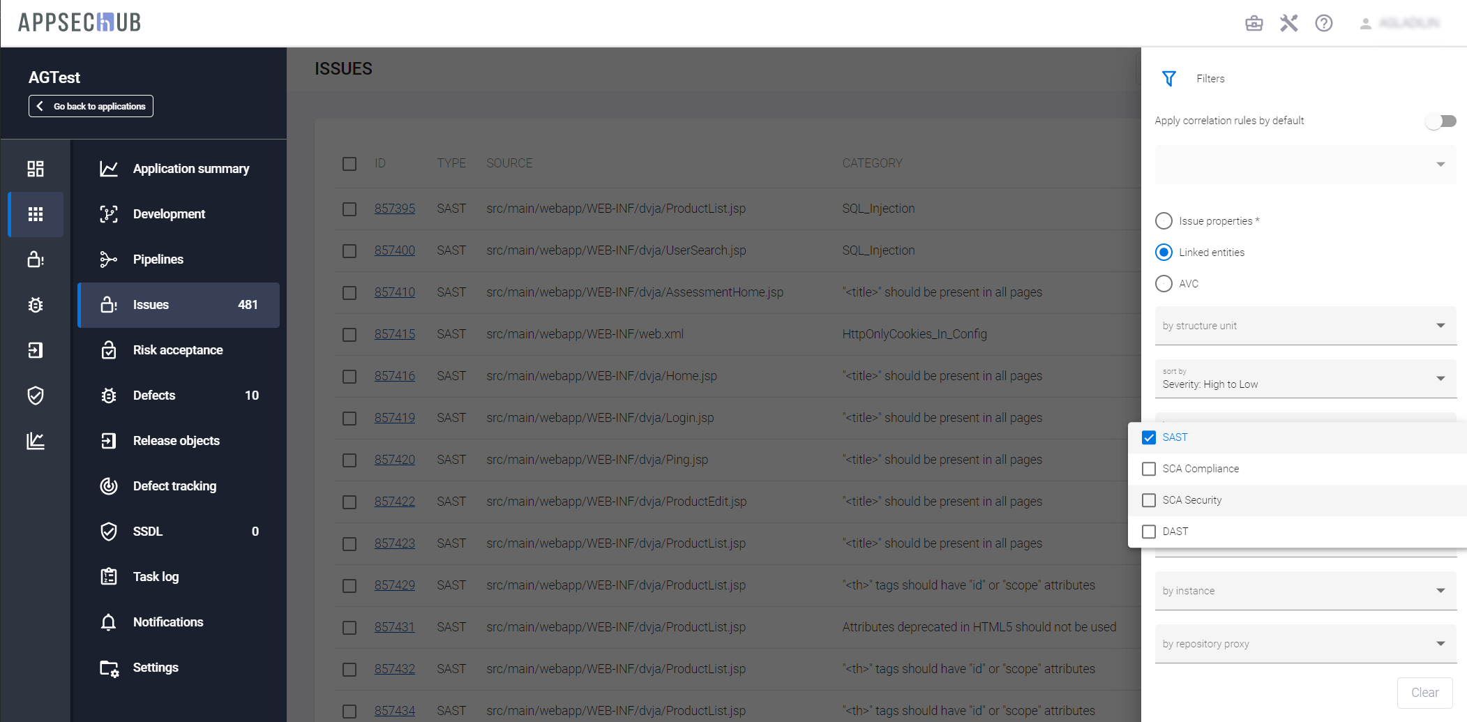 Кроме того, на общей странице проблем безопасности Issues можно задать фильтр по приложению – by application. После того, как в поле by application выбрано приложение, можно поставить дополнительный фильтр на структурные единицы приложения в поле by structure unit.