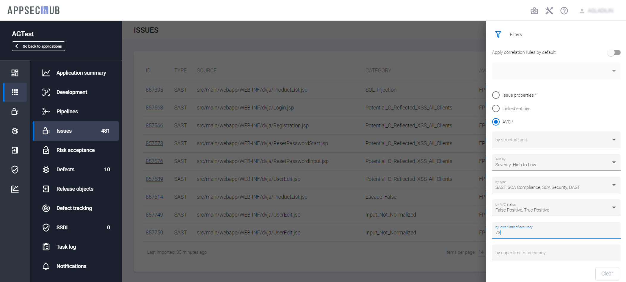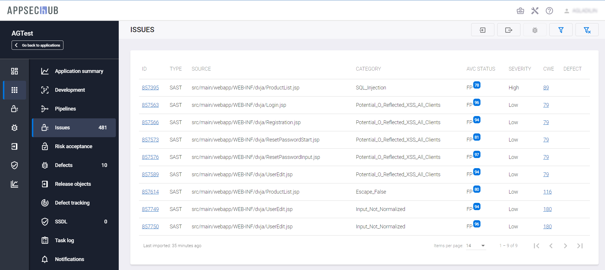 Вся отображенная на экране информация о проблемах безопасности импортируется в AppSec.Hub из инструментов AST.