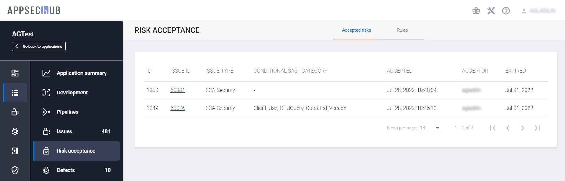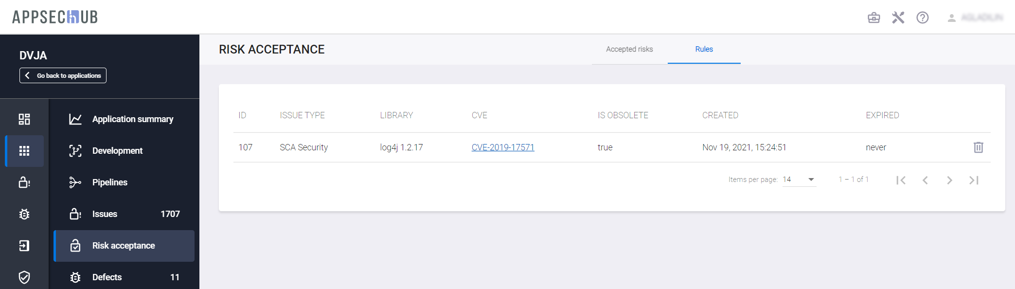 Аналогично правило может быть удалено на вкладке Rules страницы Risk Acceptance соответствующего приложения.