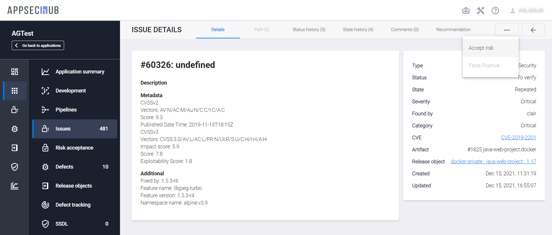 В AppSec.Hub реализован механизм добавления выявленных проблем безопасности в исключения. Наличие уязвимости, добавленной с помощью данного механизма в исключения, считается допустимым и не является блокирующим фактором, например, при принятии окончательного решения о готовности релиза к развертыванию в промышленную эксплуатацию. На данный момент в AppSec.Hub статус Accepted Risk может устанавливаться только для уязвимостей, выявленных инструментами SCA (например, Clair).