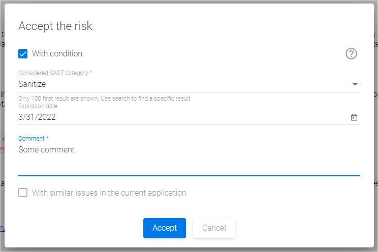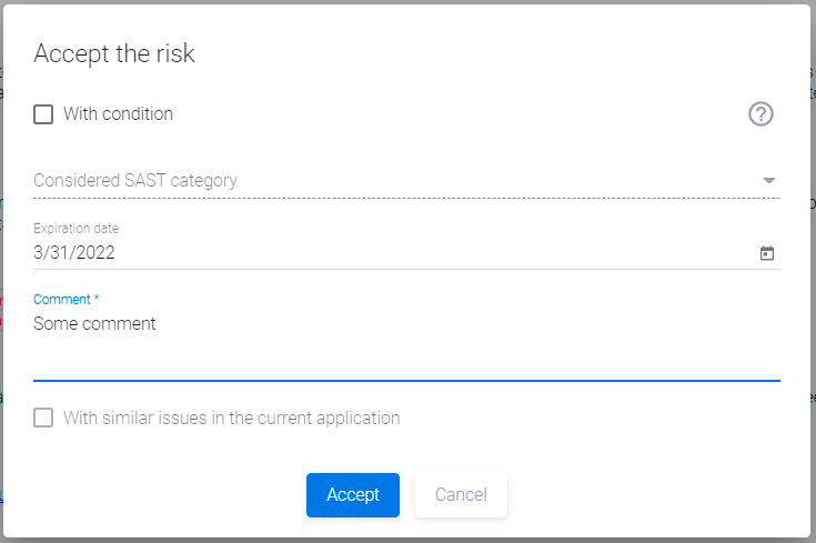 Чтобы выполнить безусловное принятие риска и исключить уязвимость из расчета Quality Gate, в появившемся окне Accept the risk достаточно указать причину в поле Comment и нажать кнопку Accept. При необходимости можно указать срок принятия риска в поле Expiration Date. Если срок не указан, риск будет принят на постоянной основе — без ограничений по времени.