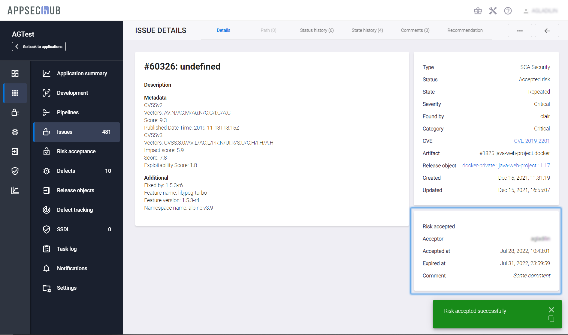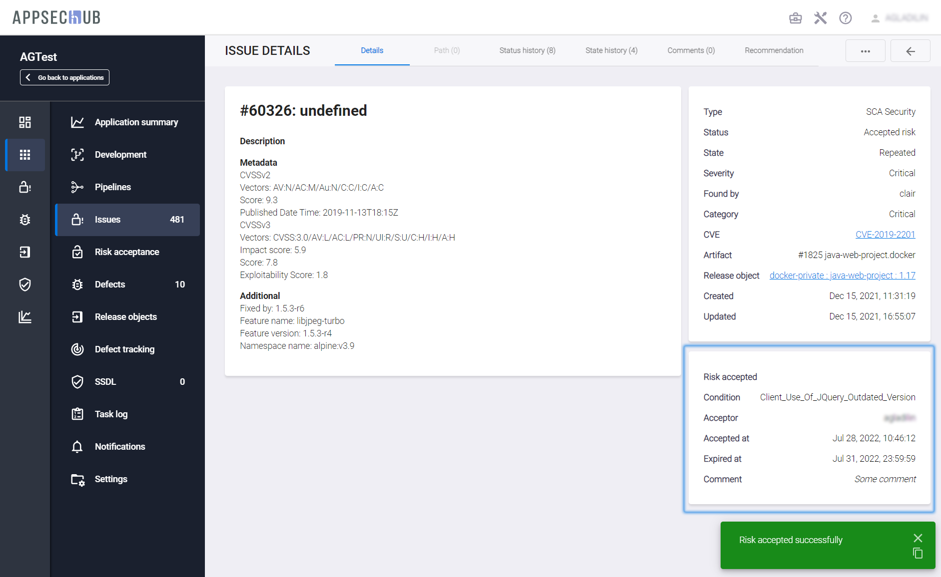 В правом нижнем углу пользовательского интерфейса на странице уязвимости появляется соответствующее подтверждающее сообщение, а в правой колонке вкладки Details — блок Risk Accepted, содержащий краткую информацию о созданном правиле: