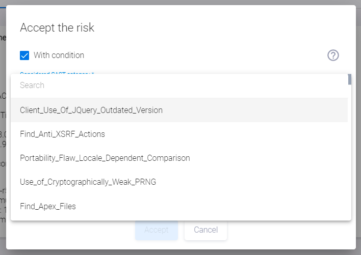 В AppSec.Hub создается необходимое правило (о практической реализации ниже), см. блок Risk accepted на рисунке ниже. В соответствии с ним, данная уязвимость учитывается при расчете Quality Gate, только если в ходе сканирования выявлена SAST-уязвимость типа All_Passwords (см. поле Condition).