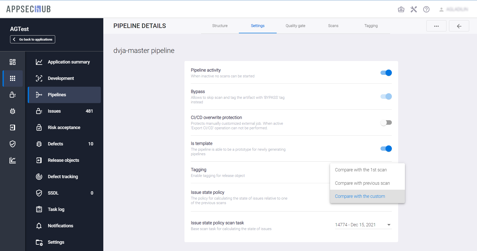 - Compare with the custom — определять состояние обнаруживаемых проблем безопасности в сравнении с результатами произвольного успешного сканирования. При выборе этого варианта на вкладке Settings настроек Security Pipelines появляется дополнительное поле Issue state policy scan task, в котором необходимо указать соответствующее сканирование.