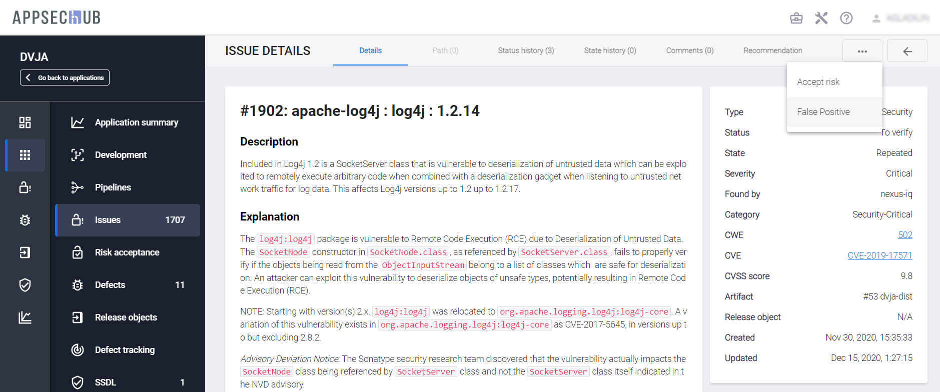 Чтобы присвоить проблеме безопасности статус False positive и создать правило в системе, перейдите на страницу с детальной информацией о соответствующей проблеме, нажав ее ID на странице Issues.
