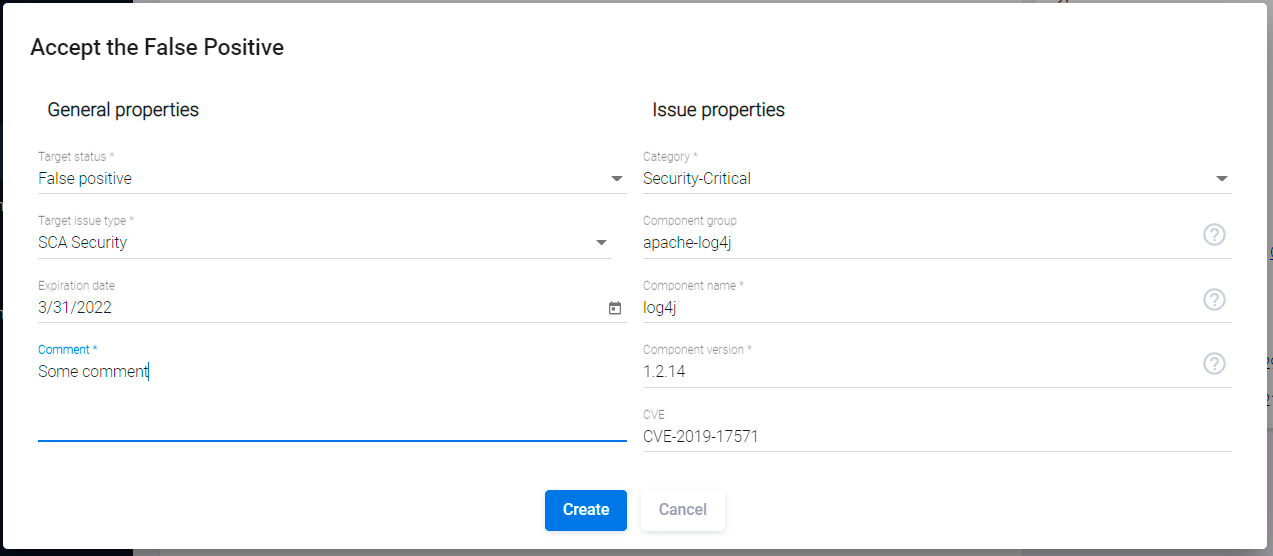 В открывшемся окне Accept the False Positive заполните или отредактируйте необходимые поля. Часть полей данного окна будет заполнена автоматически на основе информации, полученной из инструмента AST.