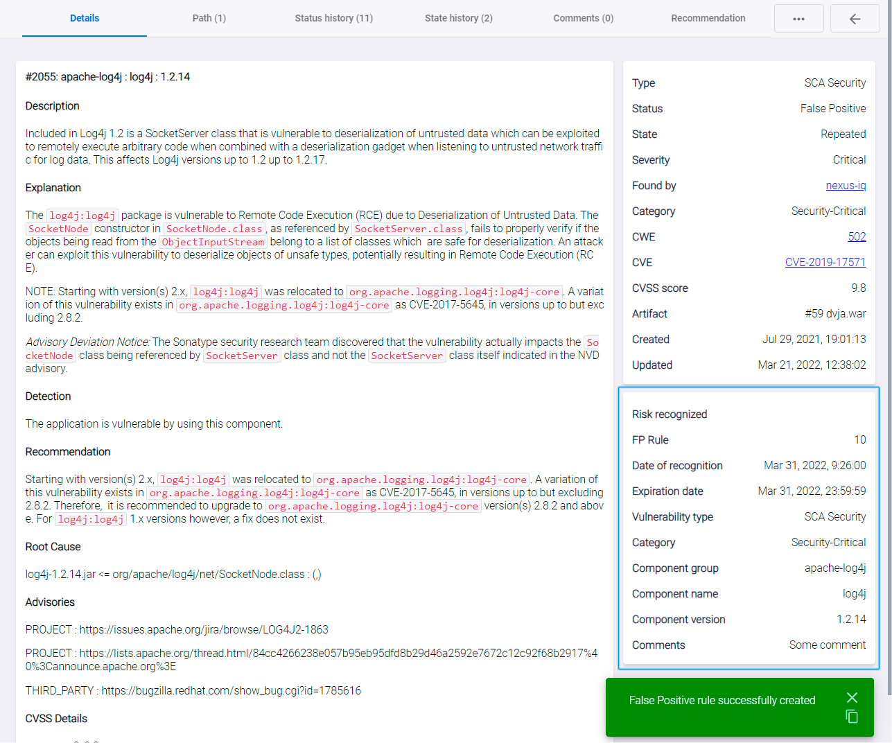 Кроме этого, в правом нижнем углу страницы с подробной информацией о соответствующей уязвимости (вкладка Details) появится карточка Risk recognized, содержащая сведения о созданном правиле.