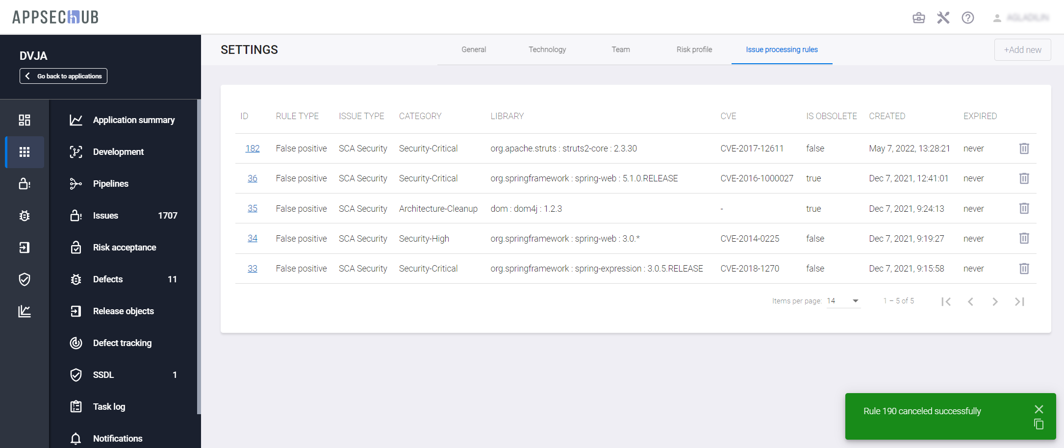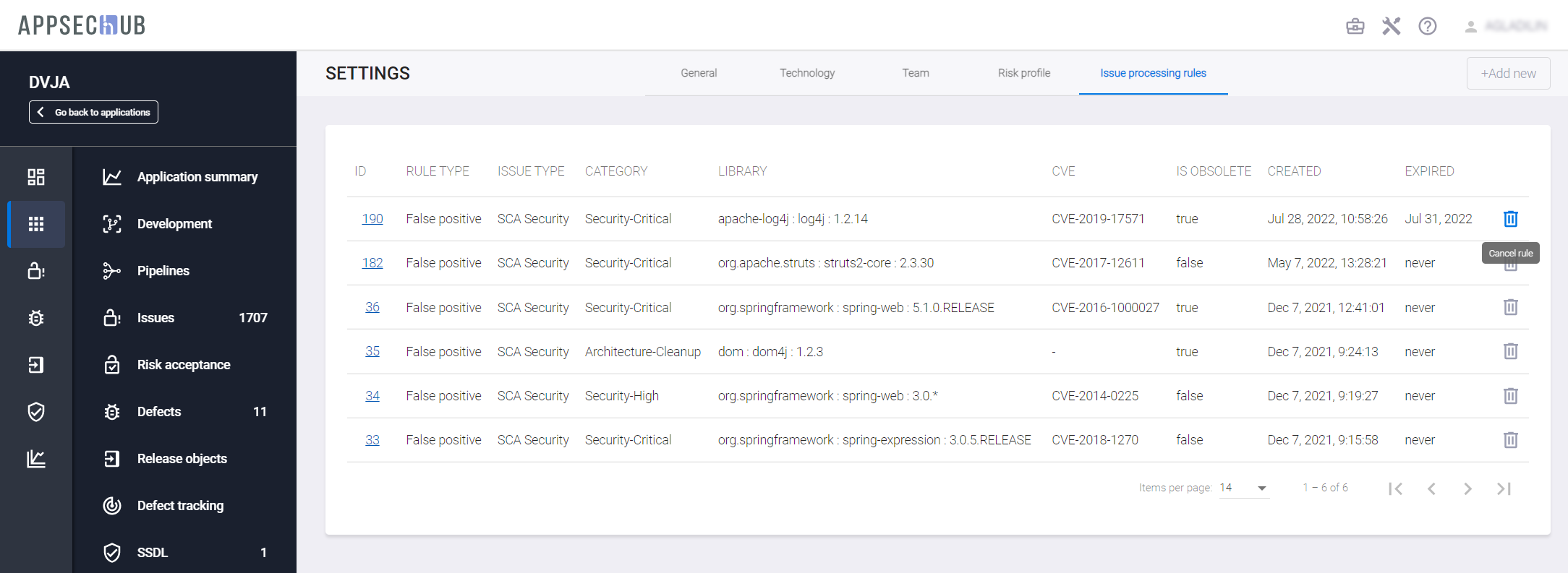 Кроме этого, информация о созданных для приложения правилах добавляется на вкладки Issue processing rules страницы Settings и Rules страницы Risk Acceptance.