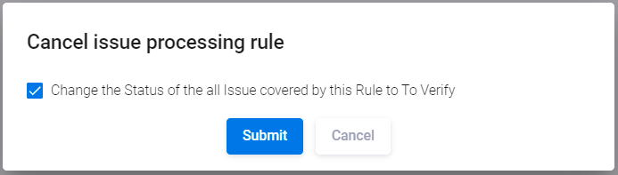 В появившемся диалоговом окне Cancel issue processing rule нажмите кнопку Submit, чтобы отменить правило. Если выбрана опция Change the Status of the all Issue covered by this Rule to To Verify, статус всех проблем безопасности, которым в соответствии с данным правилом был присвоен статус False positive, будет изменен на To Verify, в противном случае — останется без изменений.