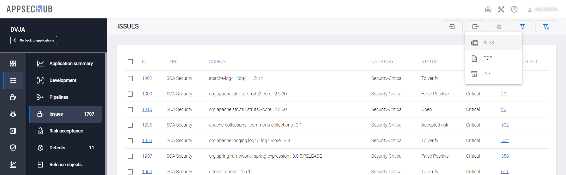 - SOURCE — источник проблемы, имя файла для проблем, выявленных SAST, или имя и версия компонента для проблем, выявленных SCA.