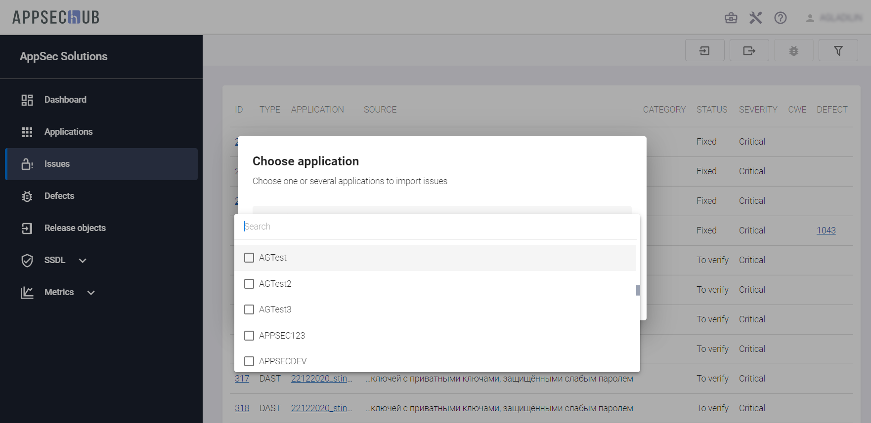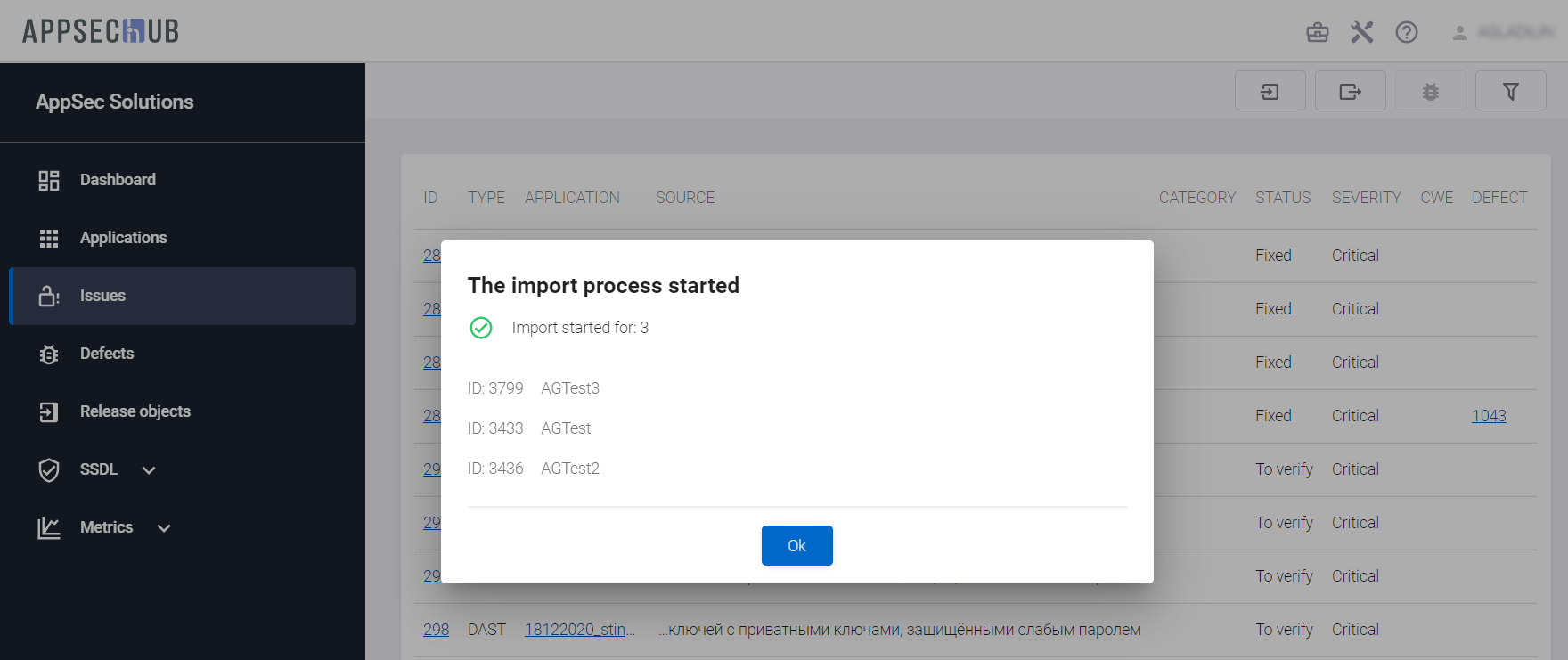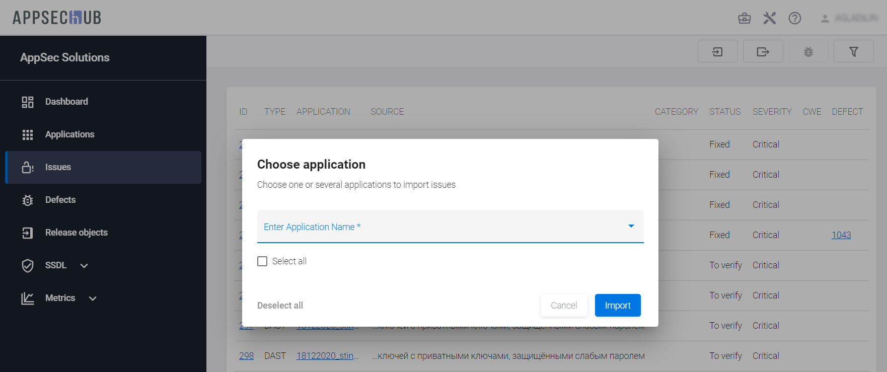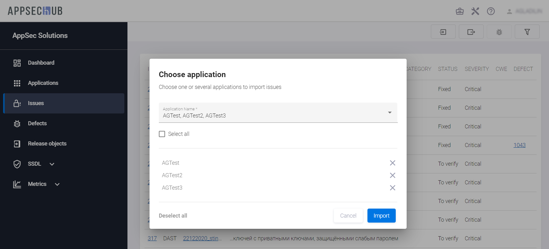 Несмотря на то, что импорт Security Issues после завершения сканирования осуществляется автоматически, предусмотрена возможность выполнить его «вручную», используя пользовательский интерфейс AppSec.Hub.