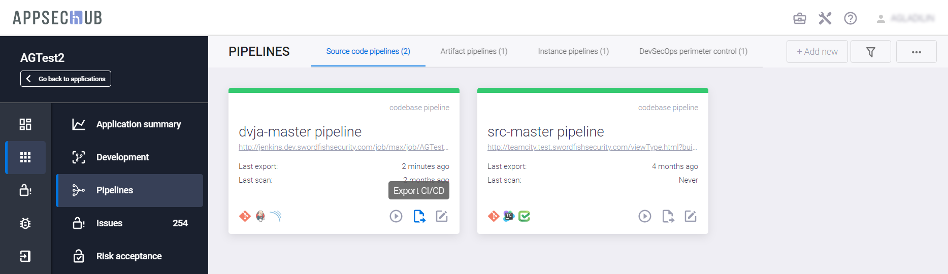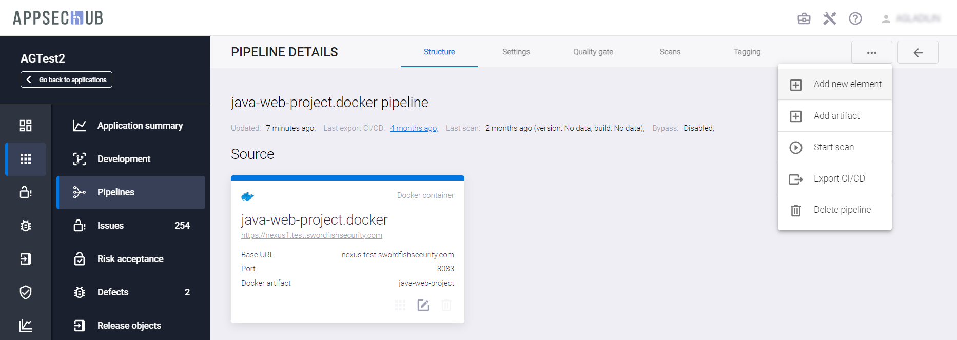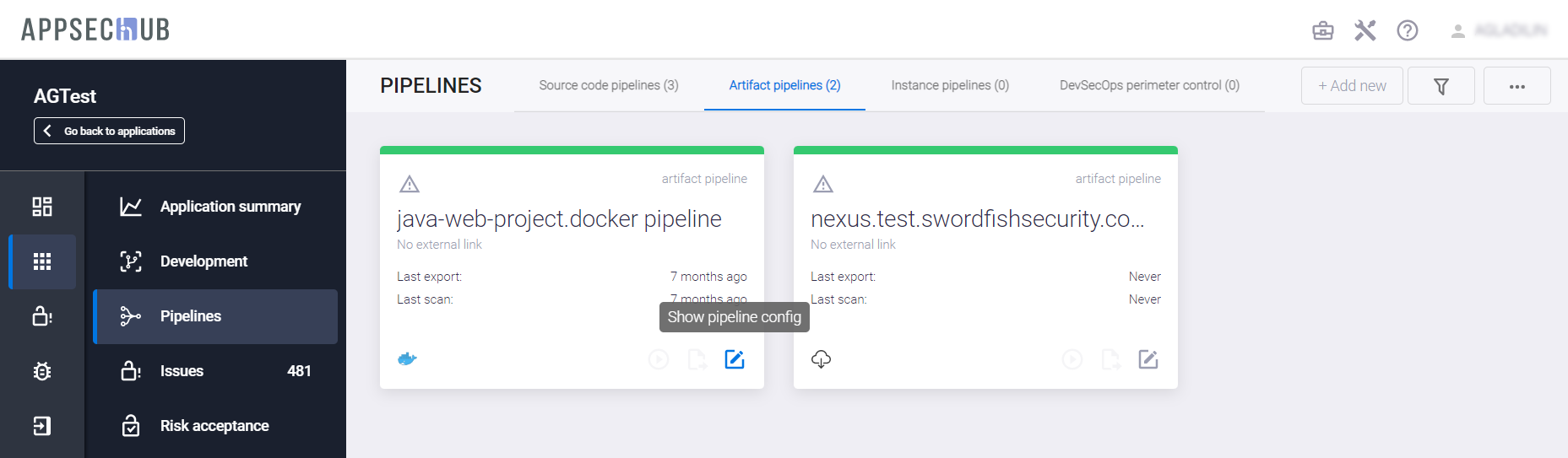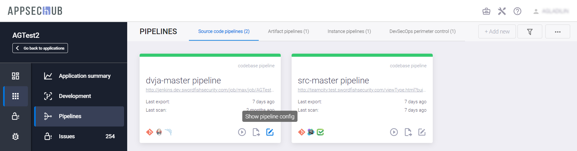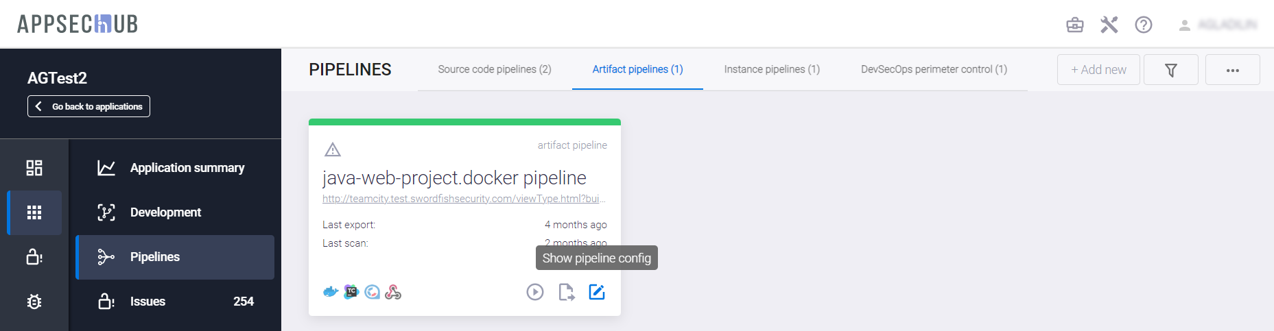 С точки зрения безопасности приложения, каждый артефакт можно просканировать, чтобы найти проблемы информационной безопасности. AppSec.Hub автоматизирует этот процесс и поддерживает DevSecOps пайплайны артефактов. Выберите пункт меню Pipelines в консоли слева и нажмите иконку Show pipeline config
