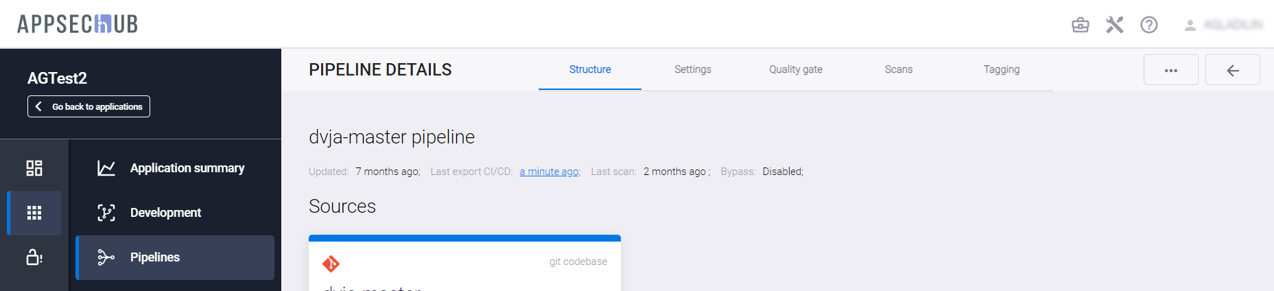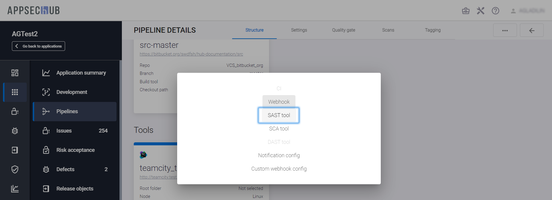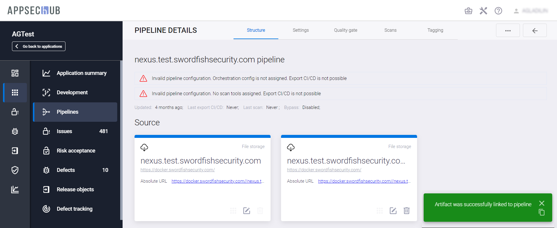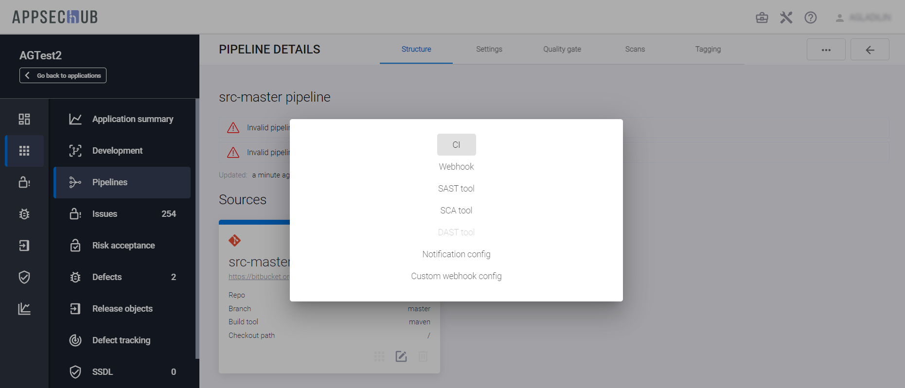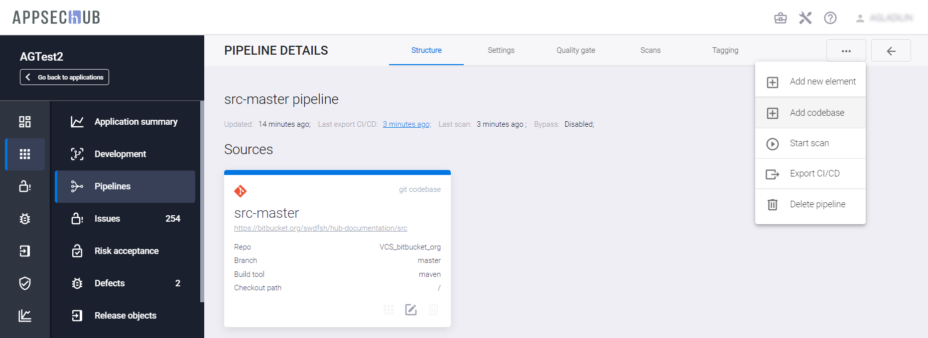 С точки зрения безопасности приложения, каждый артефакт можно просканировать, чтобы найти проблемы информационной безопасности. AppSec.Hub автоматизирует этот процесс и поддерживает DevSecOps пайплайны артефактов. Выберите пункт меню Pipelines в консоли слева и нажмите иконку Show pipeline config