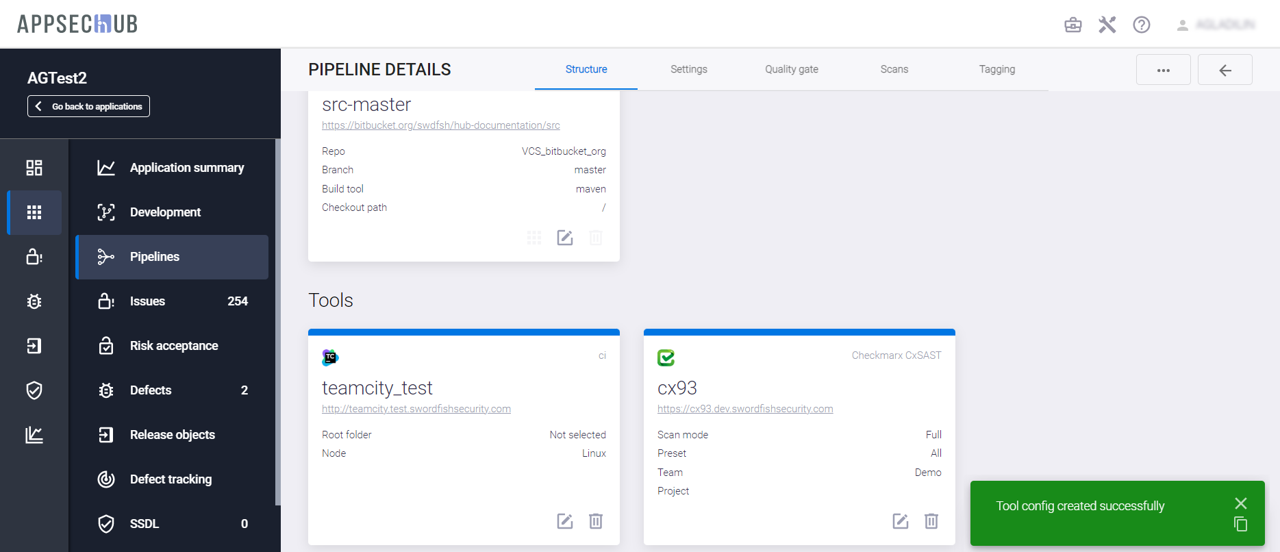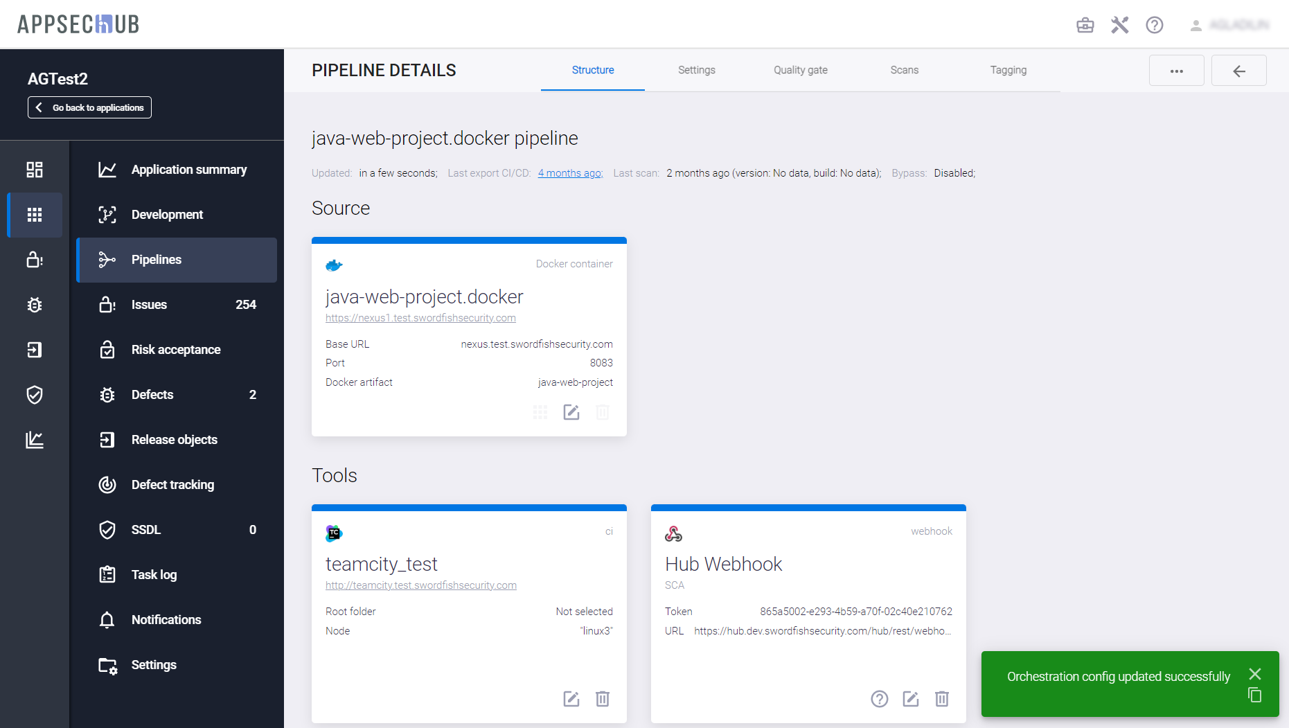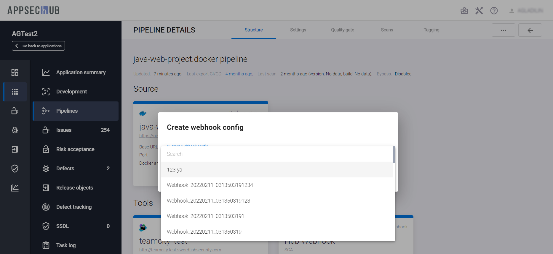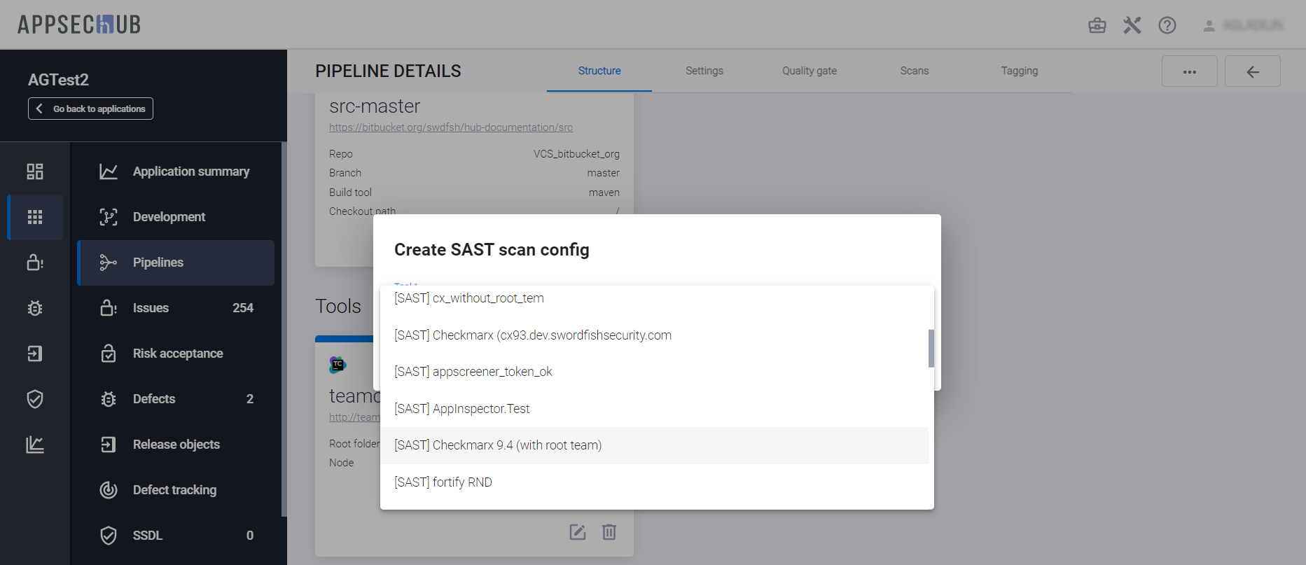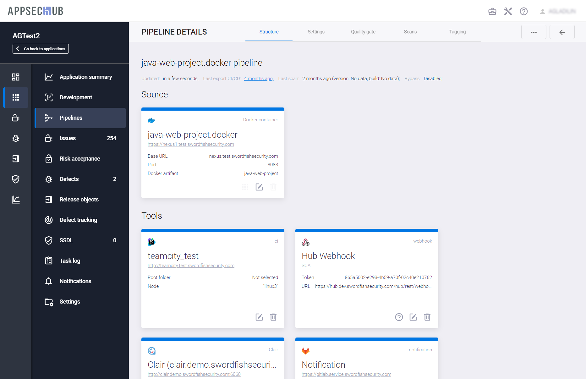 С точки зрения безопасности приложения, каждый артефакт можно просканировать, чтобы найти проблемы информационной безопасности. AppSec.Hub автоматизирует этот процесс и поддерживает DevSecOps пайплайны артефактов. Выберите пункт меню Pipelines в консоли слева и нажмите иконку Show pipeline config