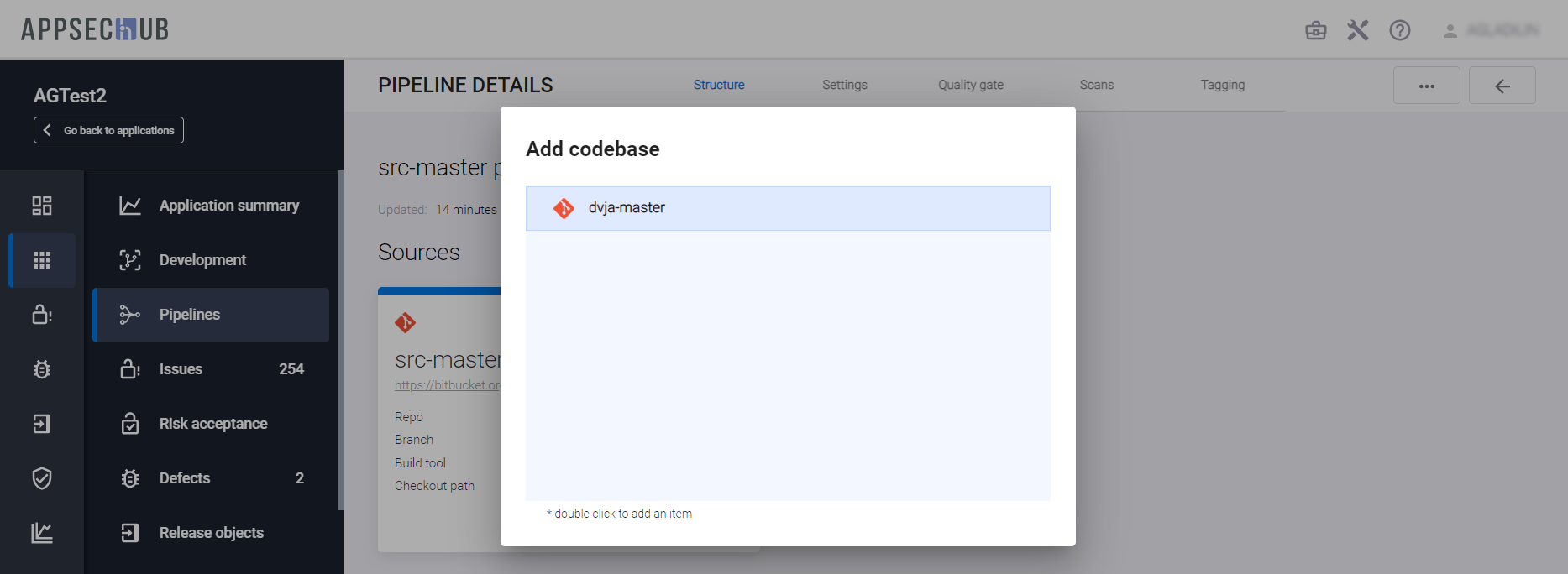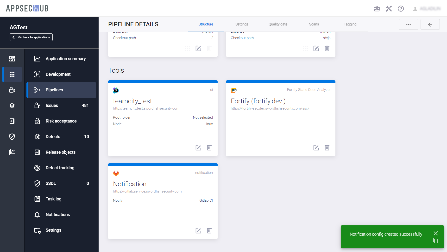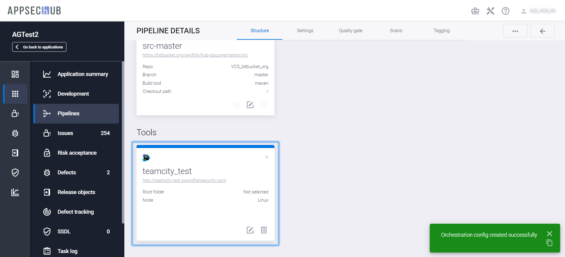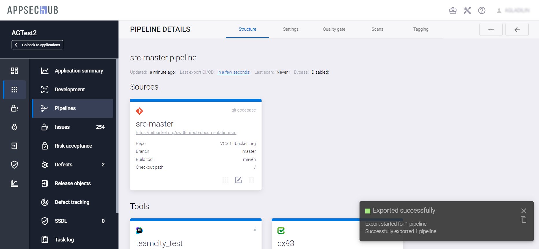 С точки зрения безопасности приложения, каждый артефакт можно просканировать, чтобы найти проблемы информационной безопасности. AppSec.Hub автоматизирует этот процесс и поддерживает DevSecOps пайплайны артефактов. Выберите пункт меню Pipelines в консоли слева и нажмите иконку Show pipeline config