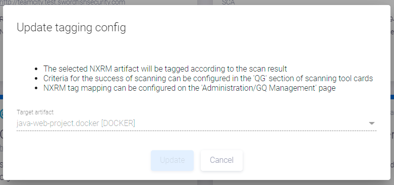 Tеги, которыми может быть помечен артефакт, определяются пользователем с правами Администратора на странице администрирования с помощью пункта меню Tagging config. Соответствующее уведомление расположено в окне Update tagging config. Настройка тегирования артефактов описана в разделе «Настройки тегирования» Руководства администратора.