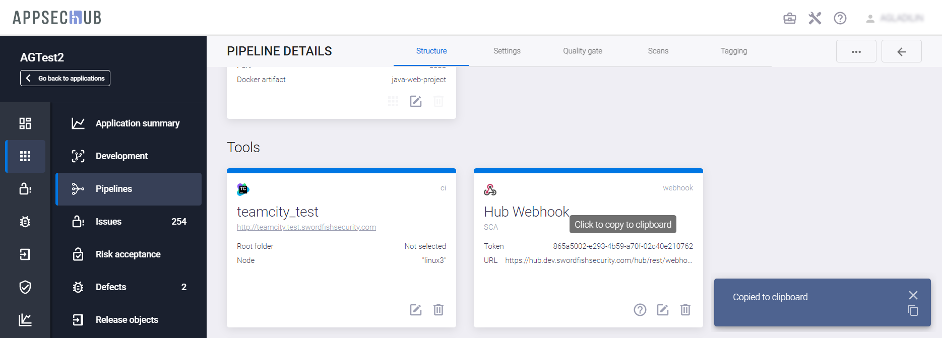 на карточке инструмента, включая метку узла, как в случае с Security Pipeline артефактов.
