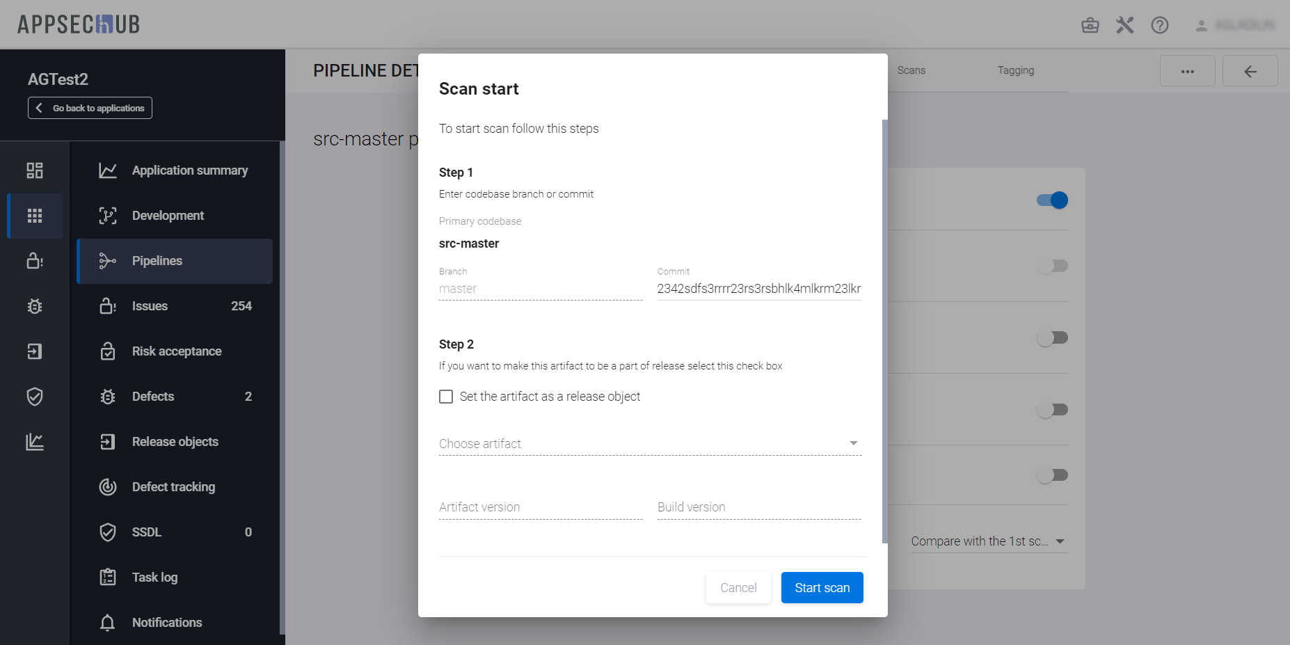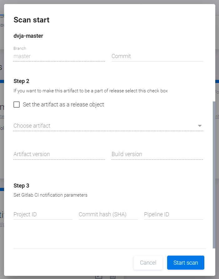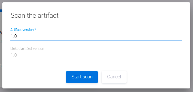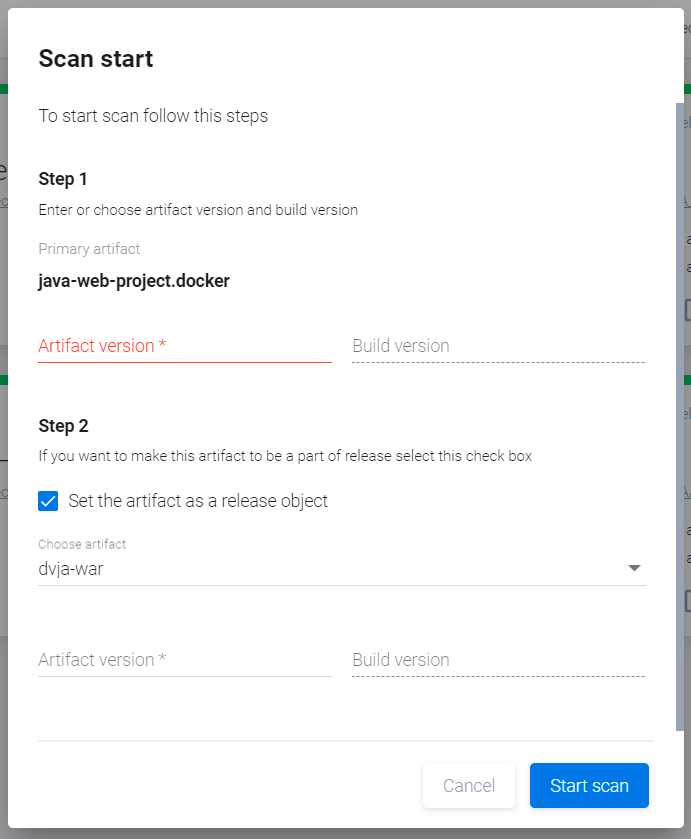 в правом верхнем углу и выберите пункт Start scan в выпадающем меню. - В появившемся окне Scan start в поле Step 1 выберите версию артефакта для сканирования из списка доступных версий в поле Artifact version и версию билда (если применимо) в поле Build version.