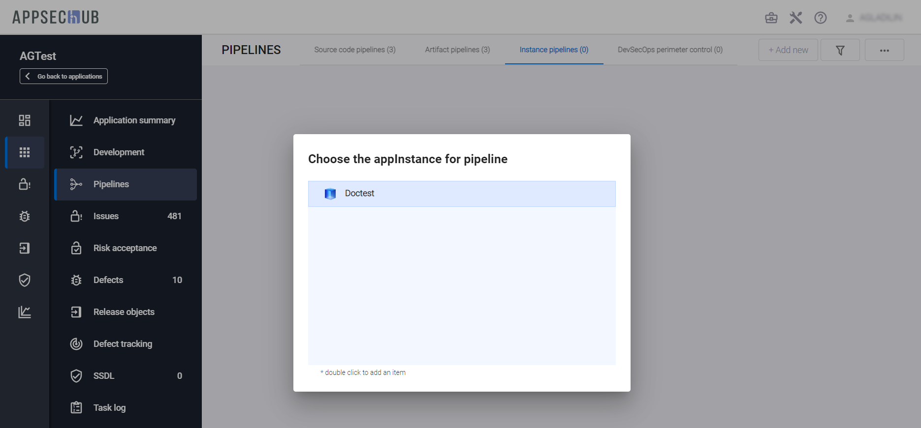 Для создания Security Pipeline экземпляра приложения, выберите элемент меню Pipelines в консоли слева, а затем нажмите кнопку +Add new в правом вернем углу вкладки Instance pipelines. В появившемся окне Choose the AppInstance for pipeline выберите и дважды кликните имя экземпляра приложения, который нужно добавить.