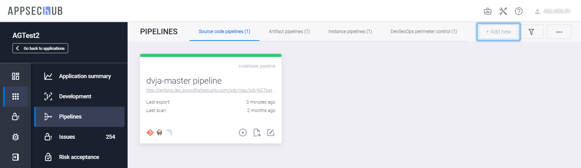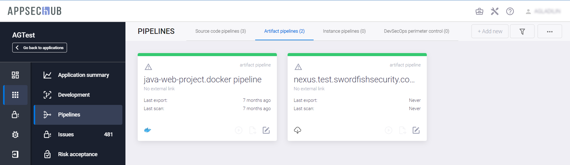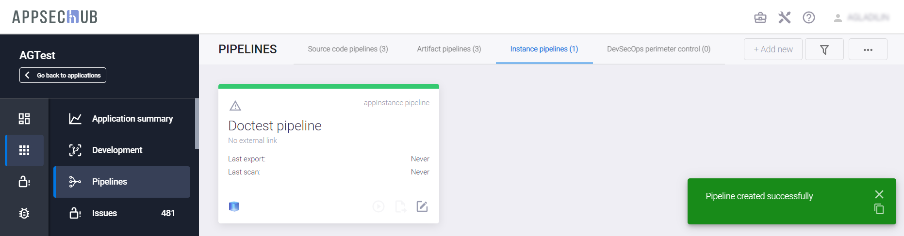 Новый Security Pipeline экземпляра приложения появляется на вкладке Instance pipelines.