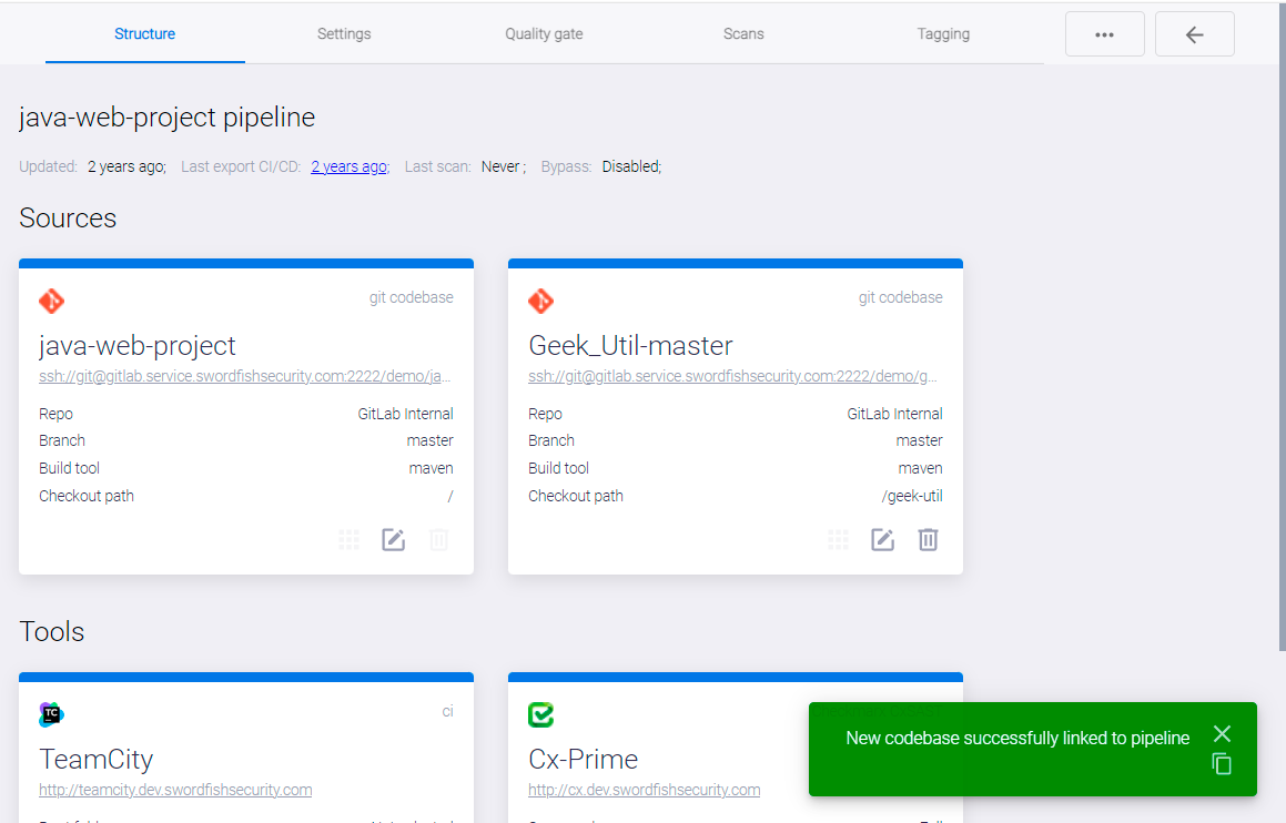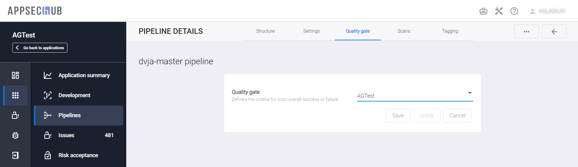 Чтобы отключить Quality Gate от Security Pipeline, нажмите кнопку Unlink.