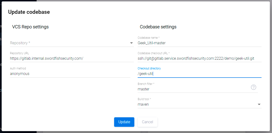 - Используемый инструмент VCS (Version Control System, система управления версиями), URL кодовой базы, тип ветки кода, инструмент сборки.